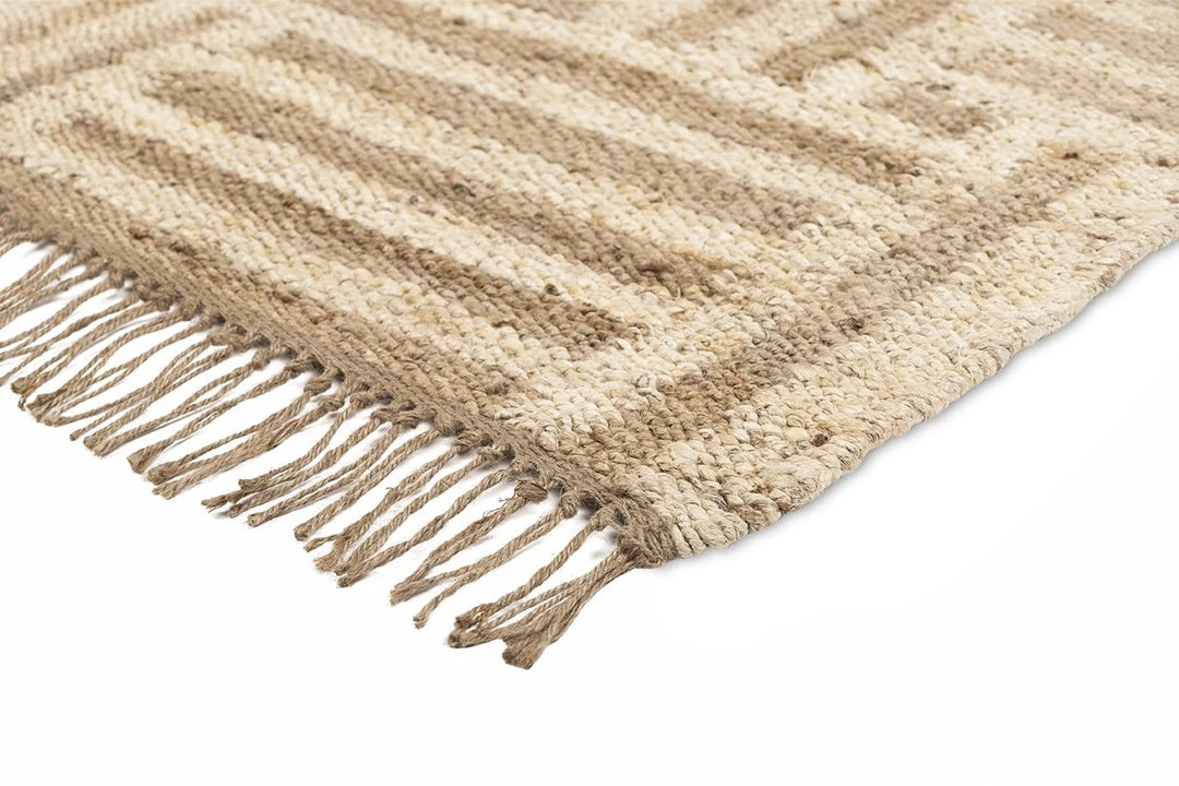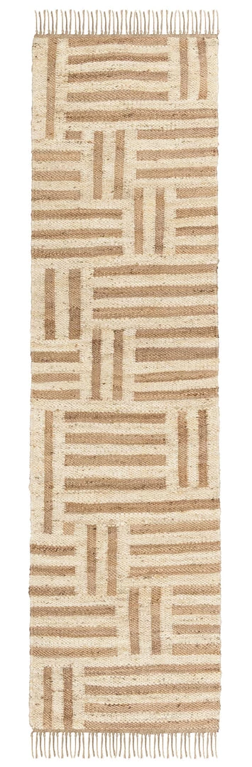 Abbie is a gorgeous natural and bleached jute runner rug woven by hand into a striped geometric pattern.