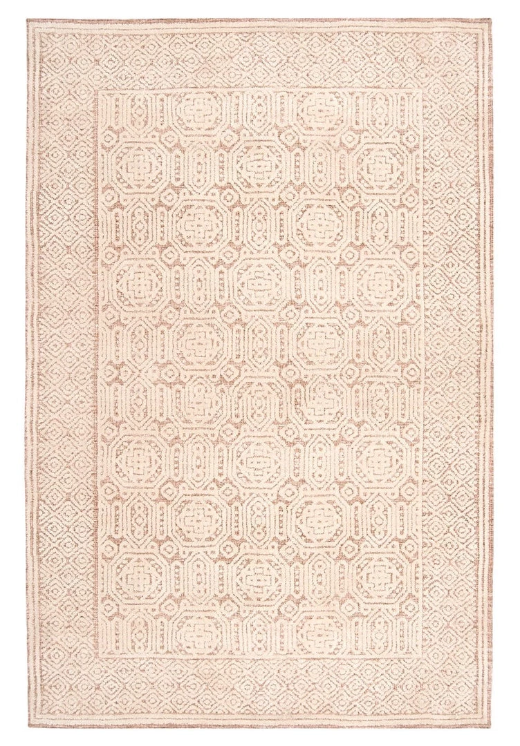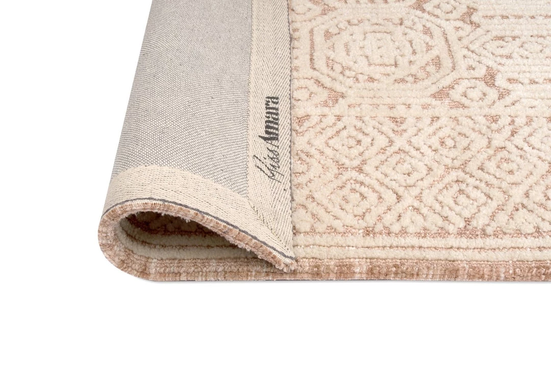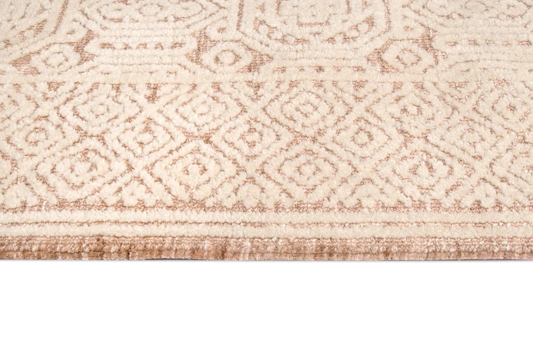 Alessandra is a beautiful blush peach rug with a warm ivory geometric tribal textured pattern.