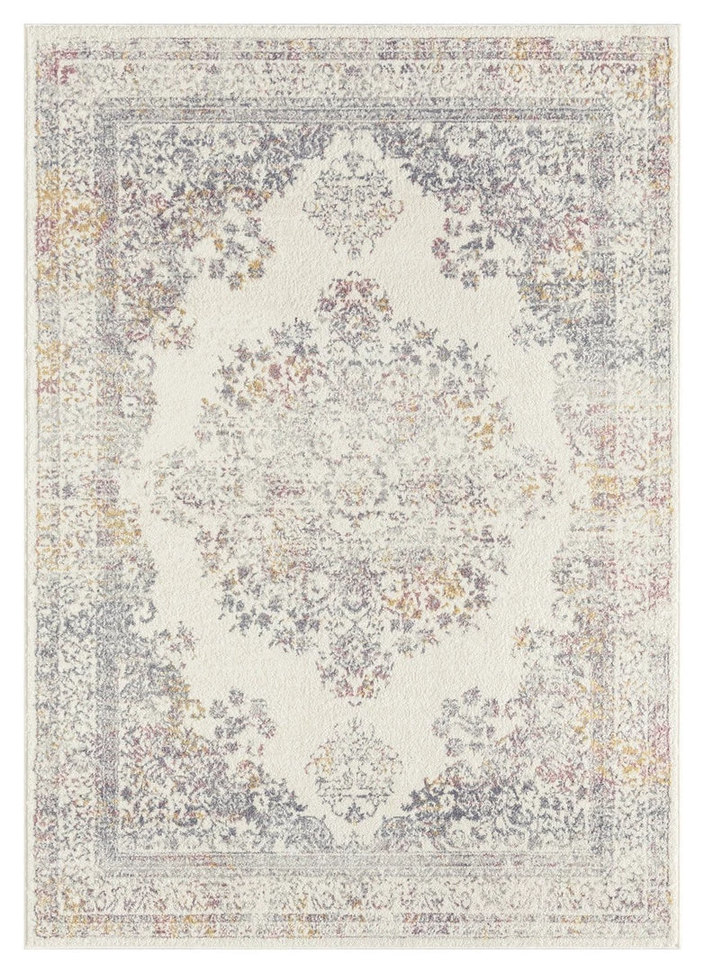 Aysha is a stunning pink, yellow and grey traditional floral medallion rug with a cream background.