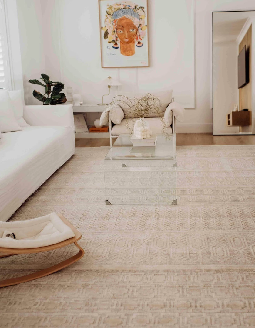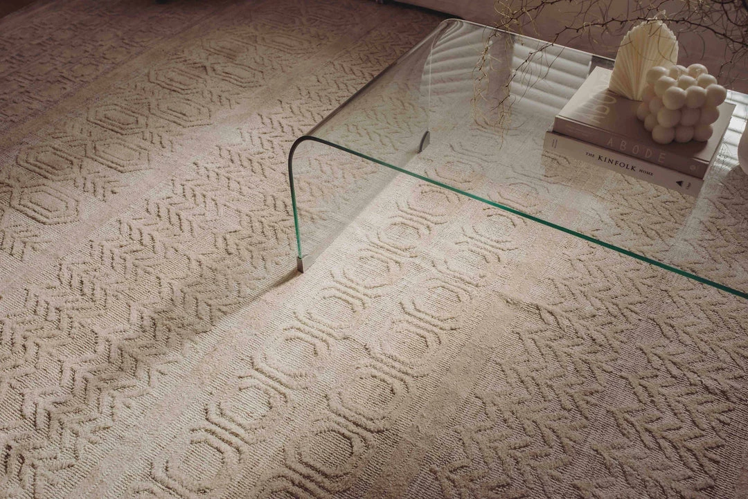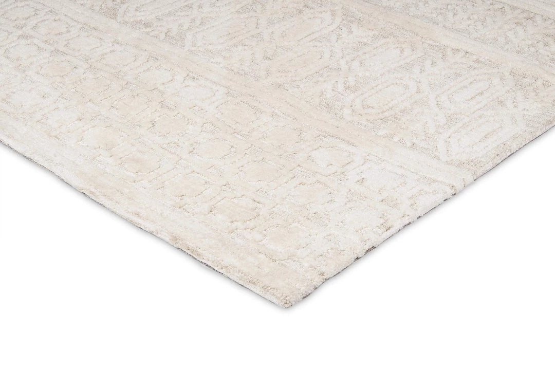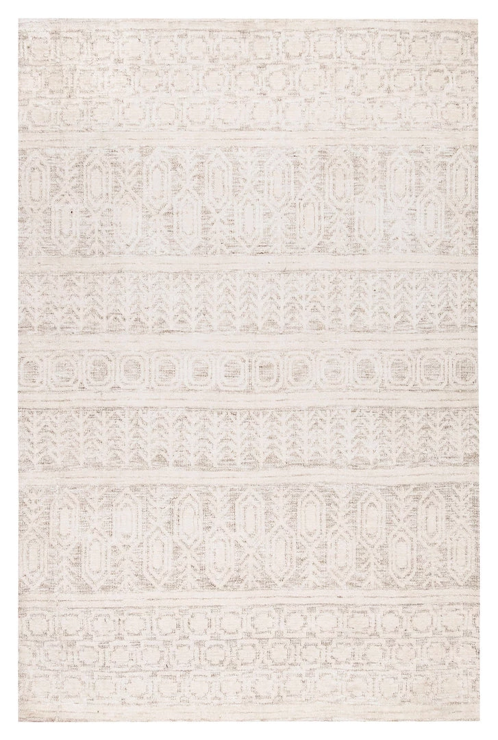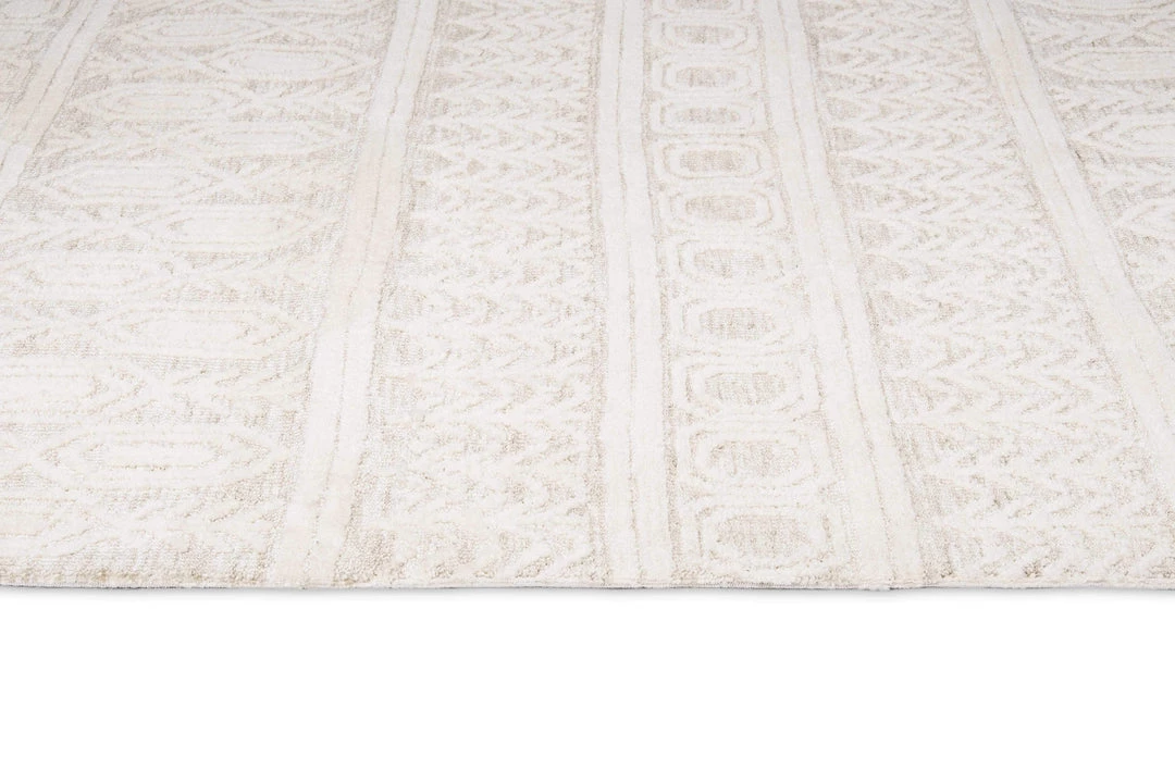 Delphine is a lovely beige transitional rug with a textured tribal print in multi-tones of ivory and cream.