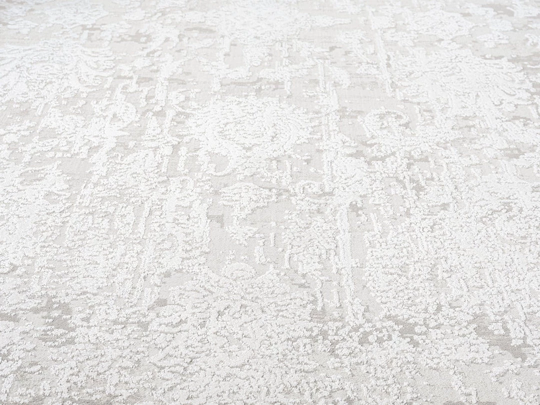 An exclusive design in the Miss Amara Collection, a distressed style decorated with elaborate floral motifs and abstract lines in transitional multi-tones of ivory and grey. Featuring an intentionally created distressed look to give it a vintage feel (a treatment called ‘abrash’ to describe colour variations common in antique rugs). A timeless and elegant addition to a modern, tribal, coastal, bohemian or vintage space.