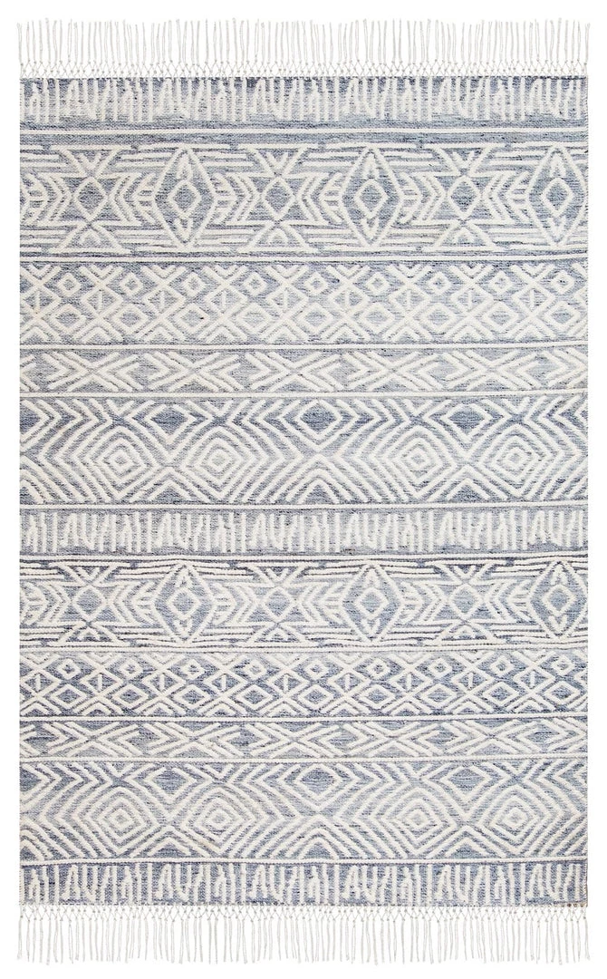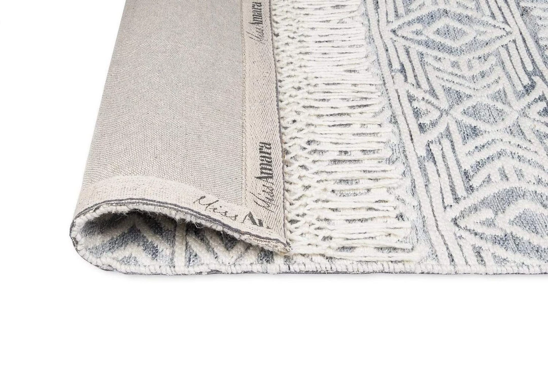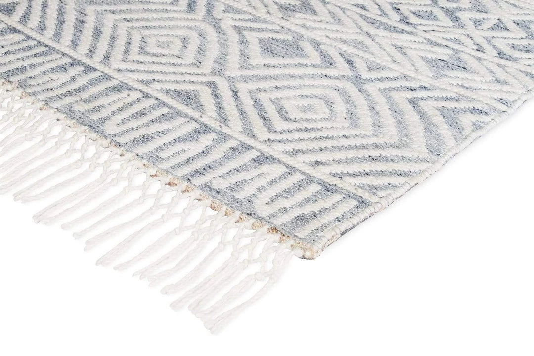 Hattie is a stunning light blue and ivory rug with a tribal-inspired pattern adorned with ivory tassels.