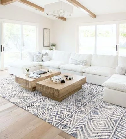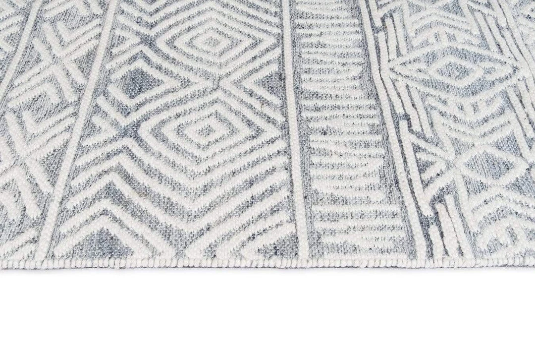 A unique and intricate lined tribal print with a transitional multi-toned palette of blue, grey, ivory and subtle hints of warm yellow. This high design piece would blend beautifully in a modern, tribal, scandi, bohemian or coastal-inspired interior.