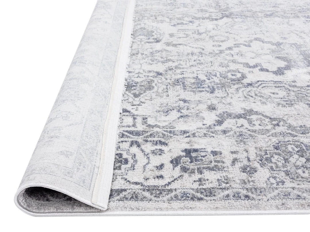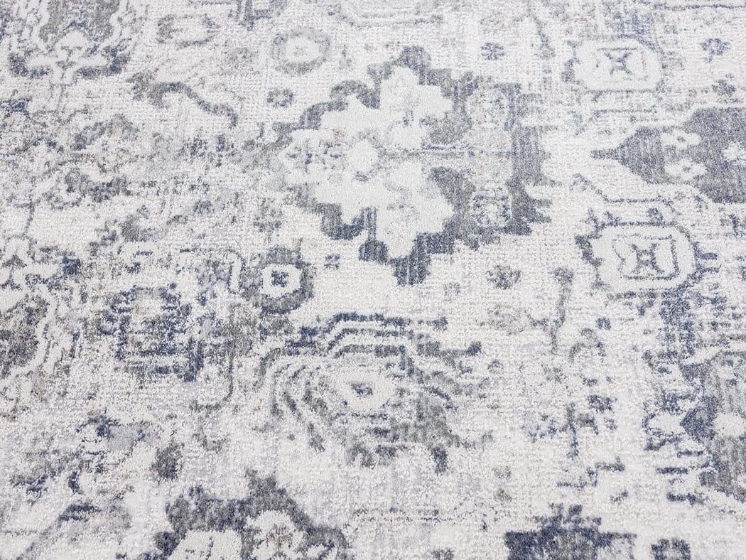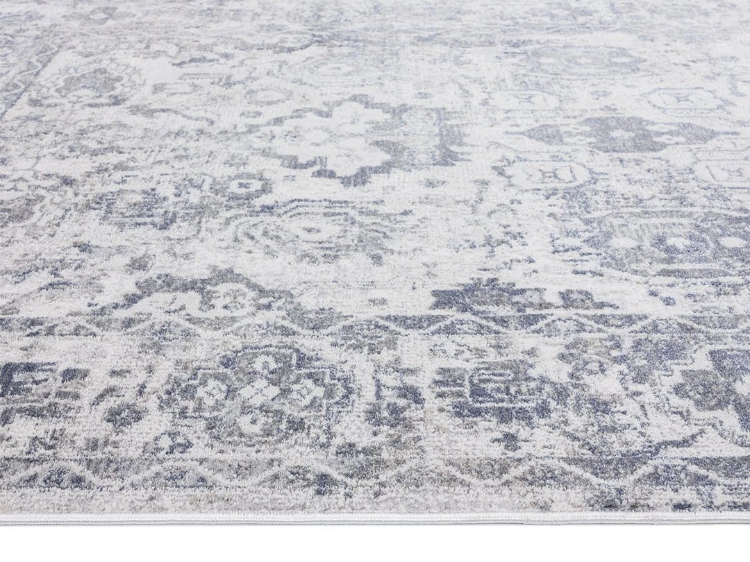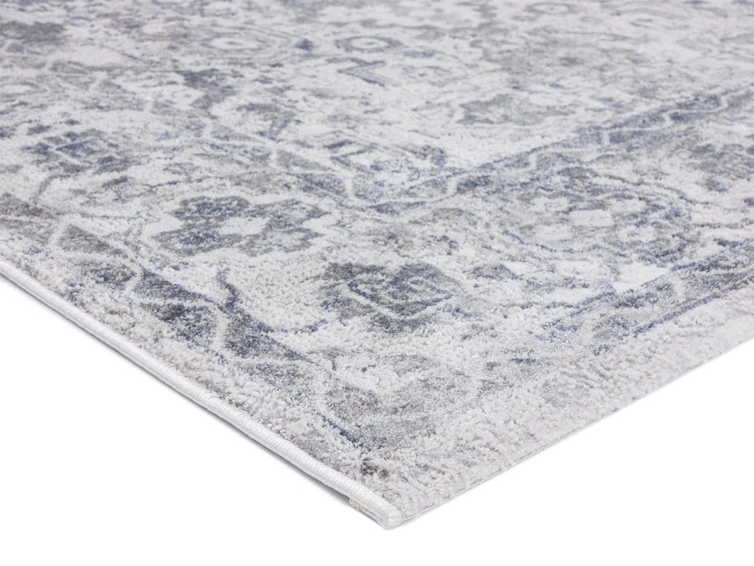 A stunning traditional style of stone grey, featuring hints of deep blue with ivory in a traditional ornate bordered floral design.