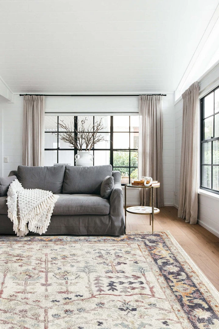 A modern design with an old world charm, Indiana is a bordered vintage style that’s decorated with elaborate floral motifs and ornate patterns in transitional multi-tones of cream, purple, blue, brown and orange. A timeless and elegant addition to a modern, classic, bohemian or vintage space.