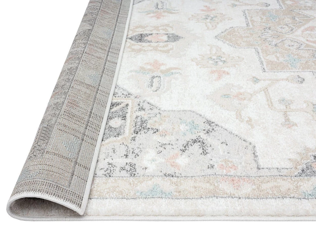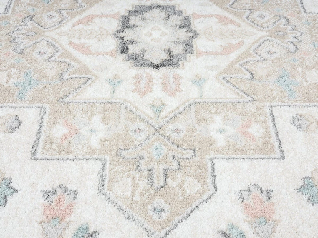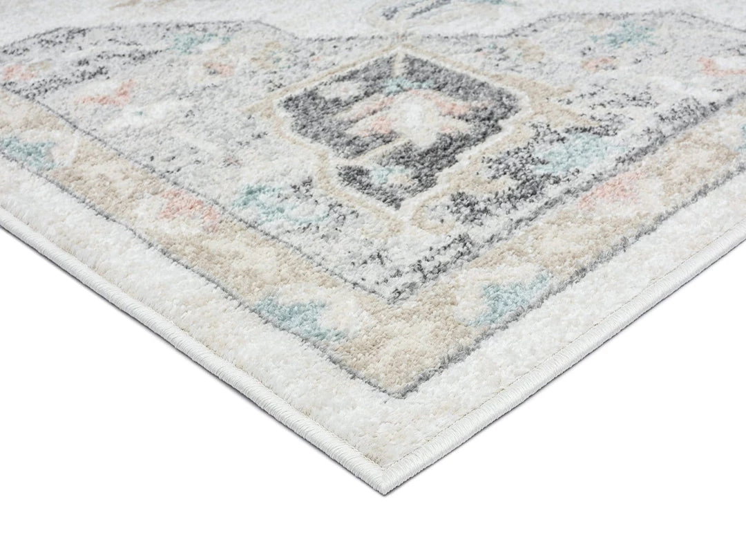 An exclusive design in the Miss Amara Collection, Ingrid is a bordered vintage distressed style. Decorated with elaborate floral motifs and ornate patterns in transitional multi-tones of ivory, grey, powder blue and pastel pink. A timeless and elegant addition to a modern, classic, bohemian or vintage space.