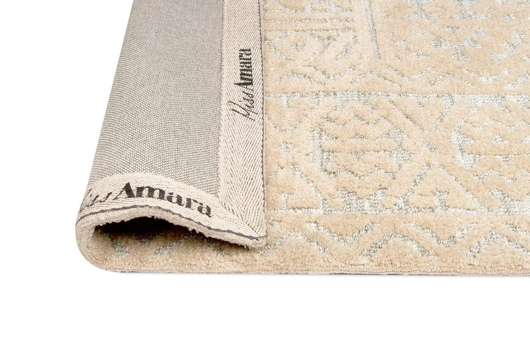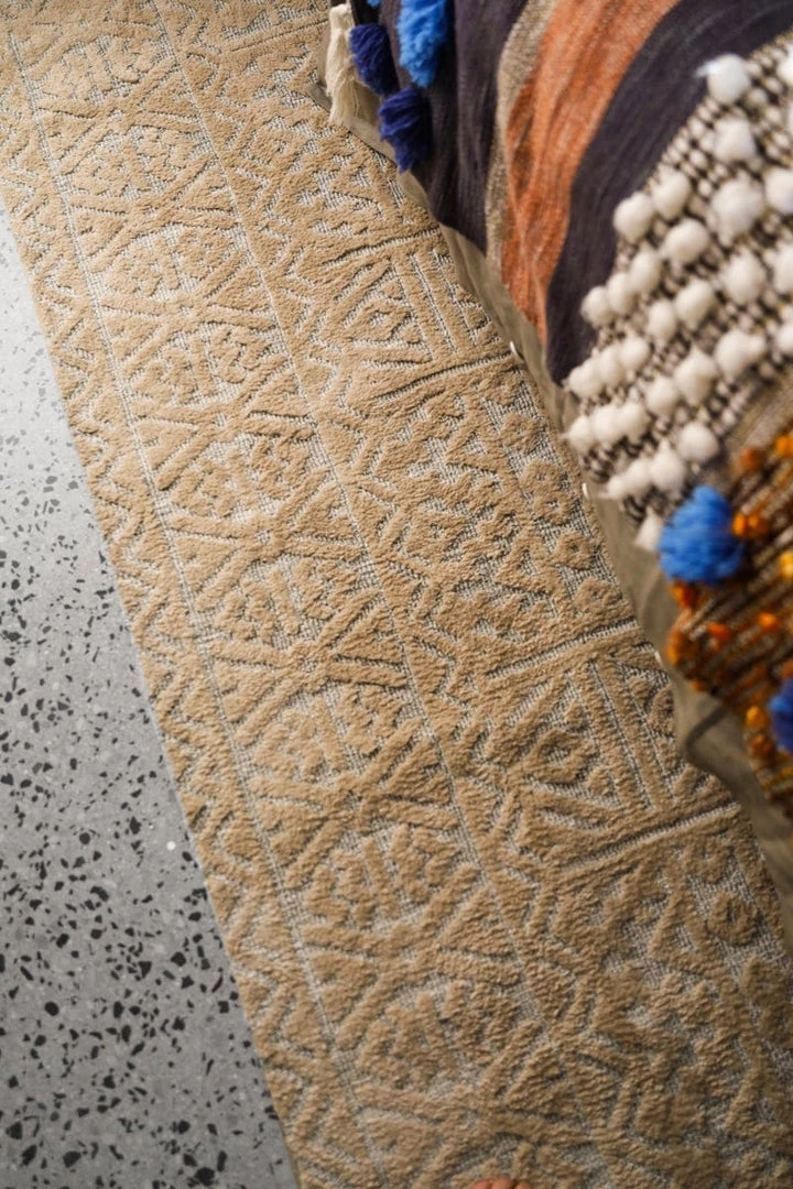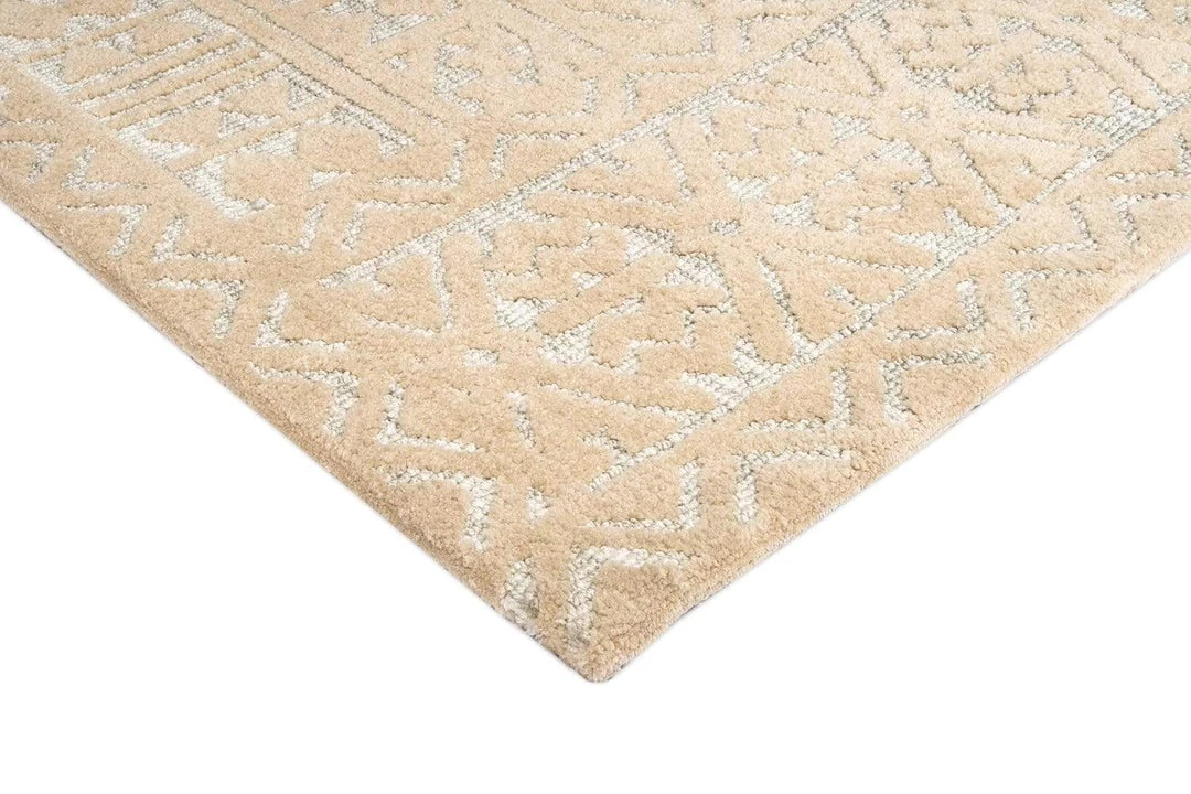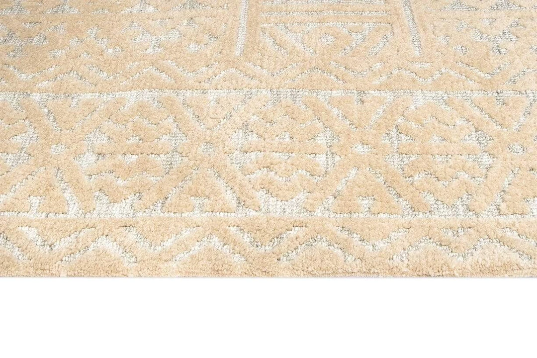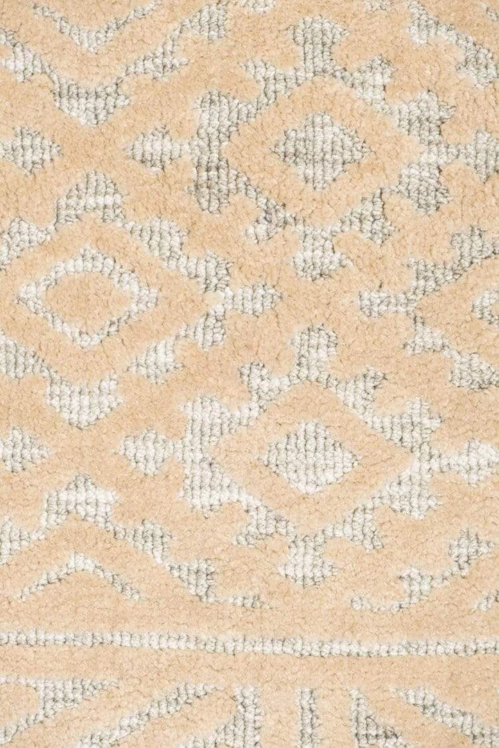 Kaia is a beautiful transitional blend of warm cream and beige rug crafted in a unique textured hi-low tribal print on a muted grey and hushed green background.