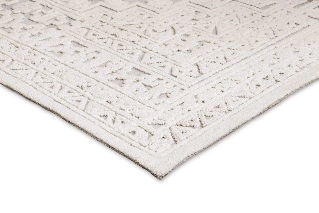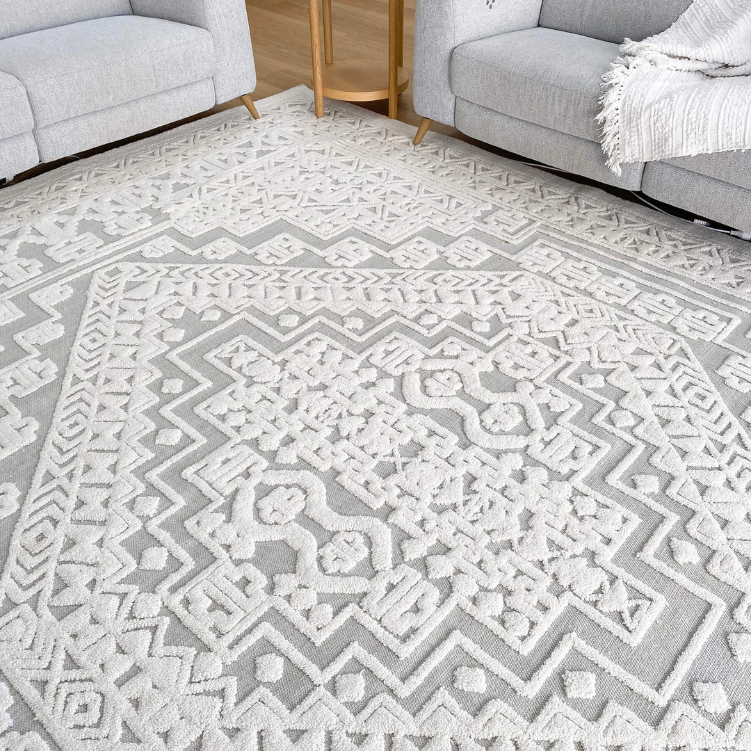Kirrily is a beautiful blue-grey and ivory rug crafted with a unique diamond tribal print on a muted grey and blue background.