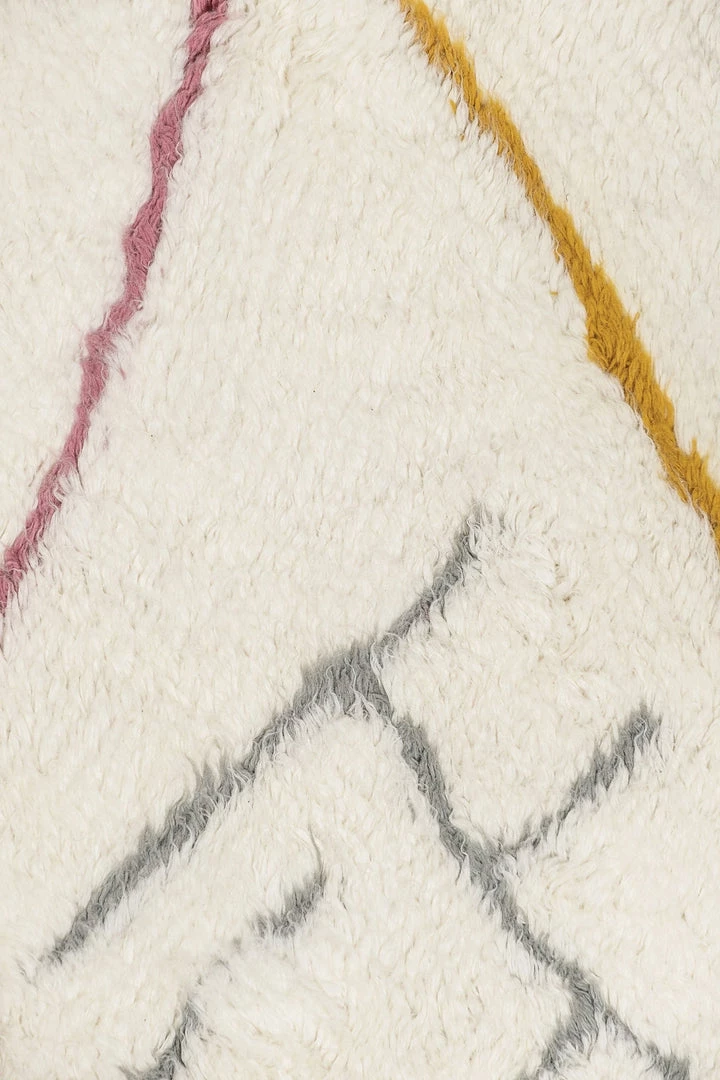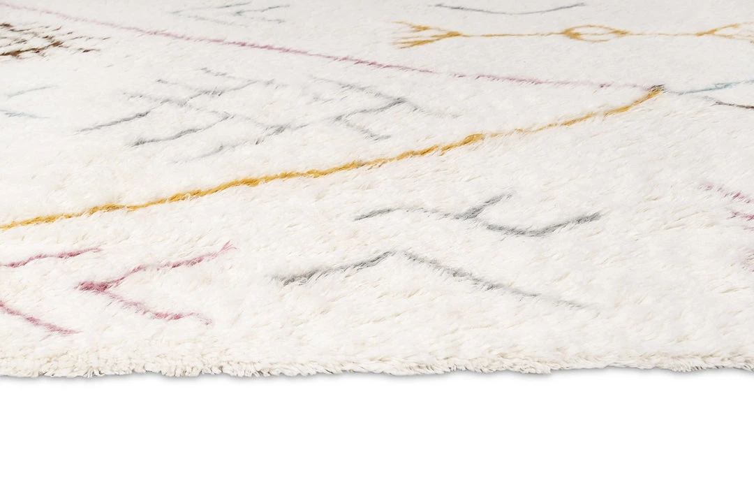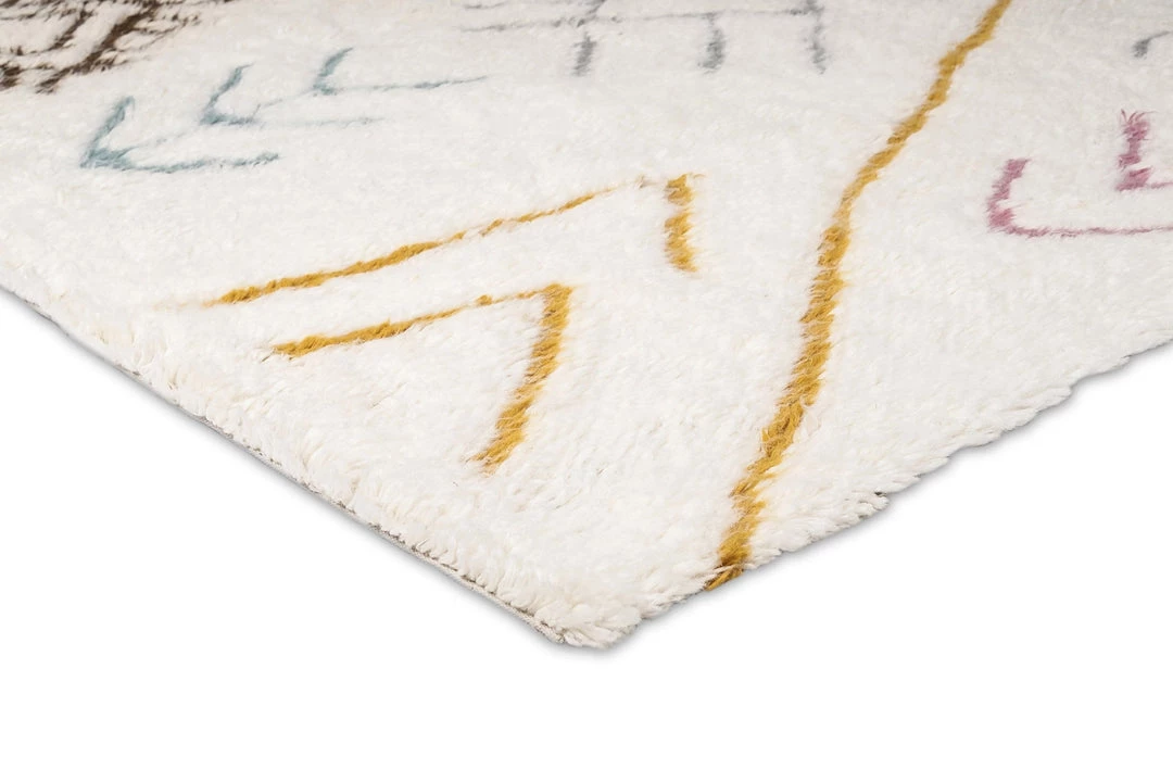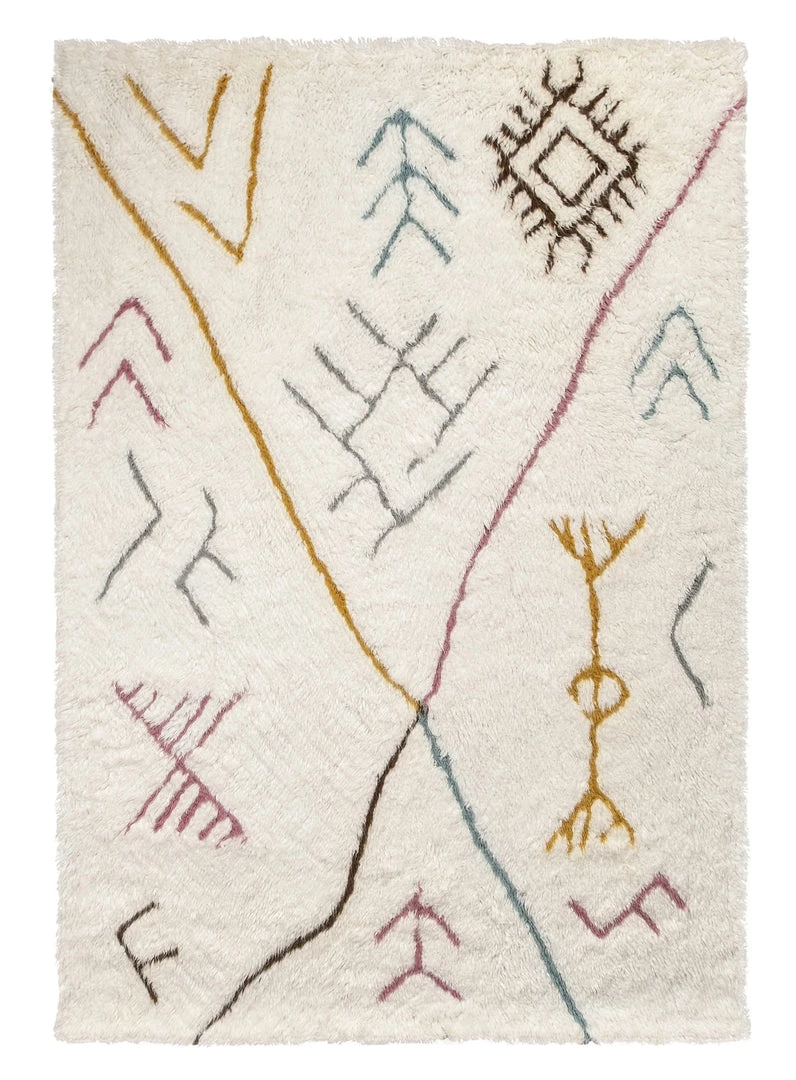 Lainie is a stunning multi-colour wool shag rug with a unique abstract tribal pattern in tones of pastel pink, blue, mustard yellow, brown and grey on a background of natural ivory.