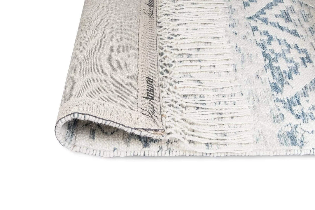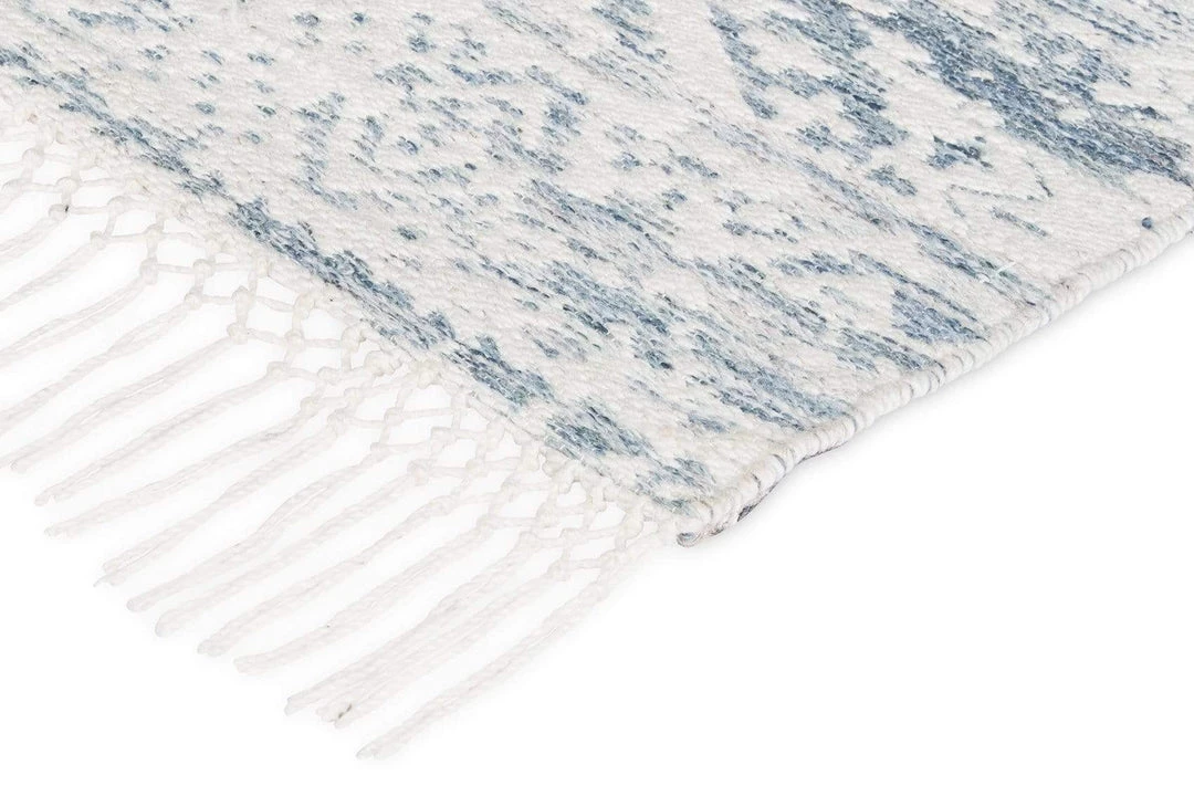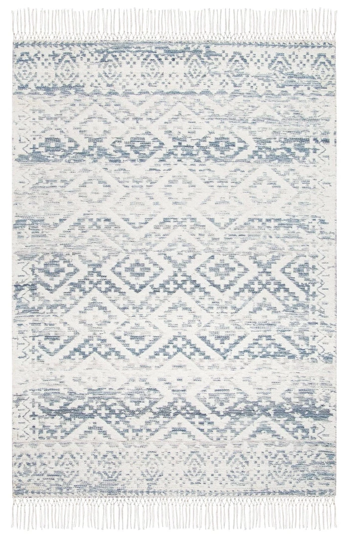 Larissa is a lovely blue and ivory rug with a tribal-inspired pattern adorned with ivory tassels.