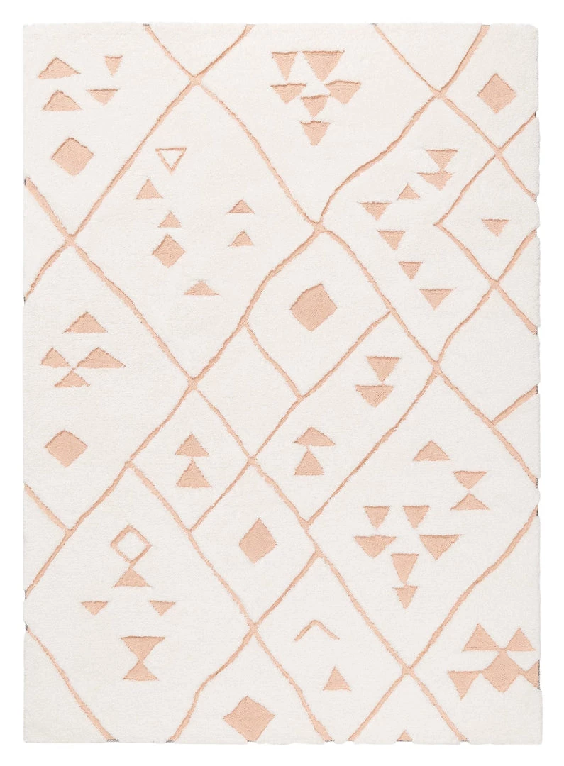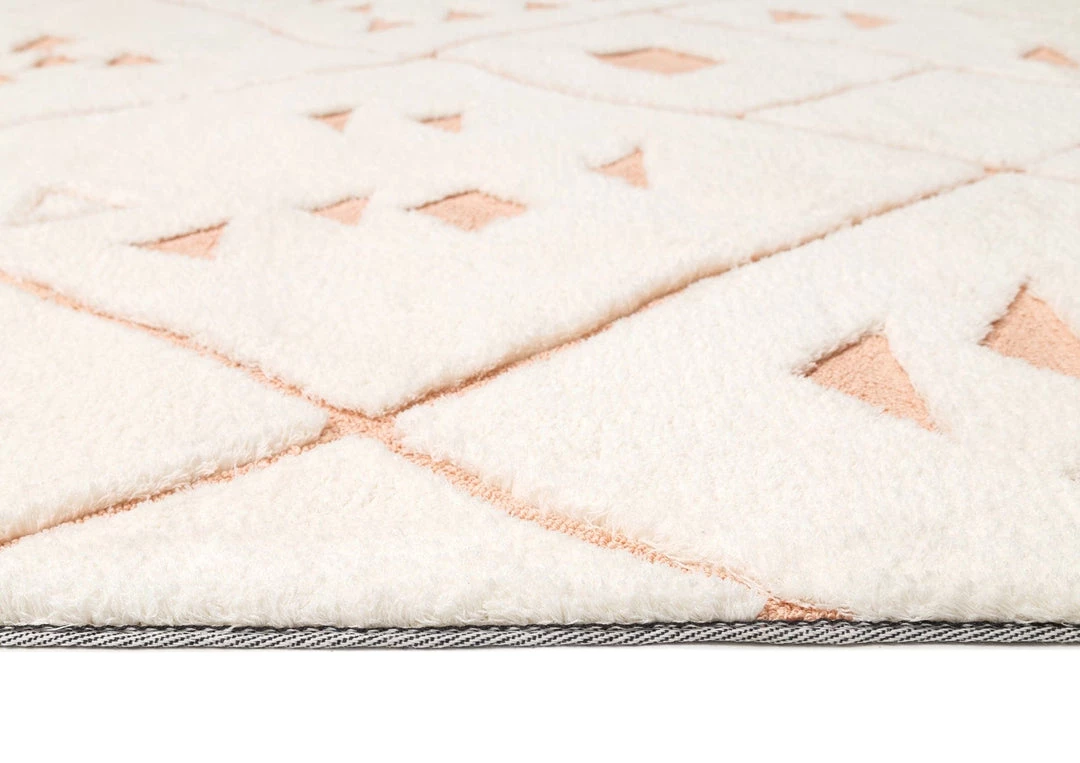 Leesha is a lovely carved shag rug, featuring a blend of cream complemented by an abstract diamond tribal pattern in peach tones.