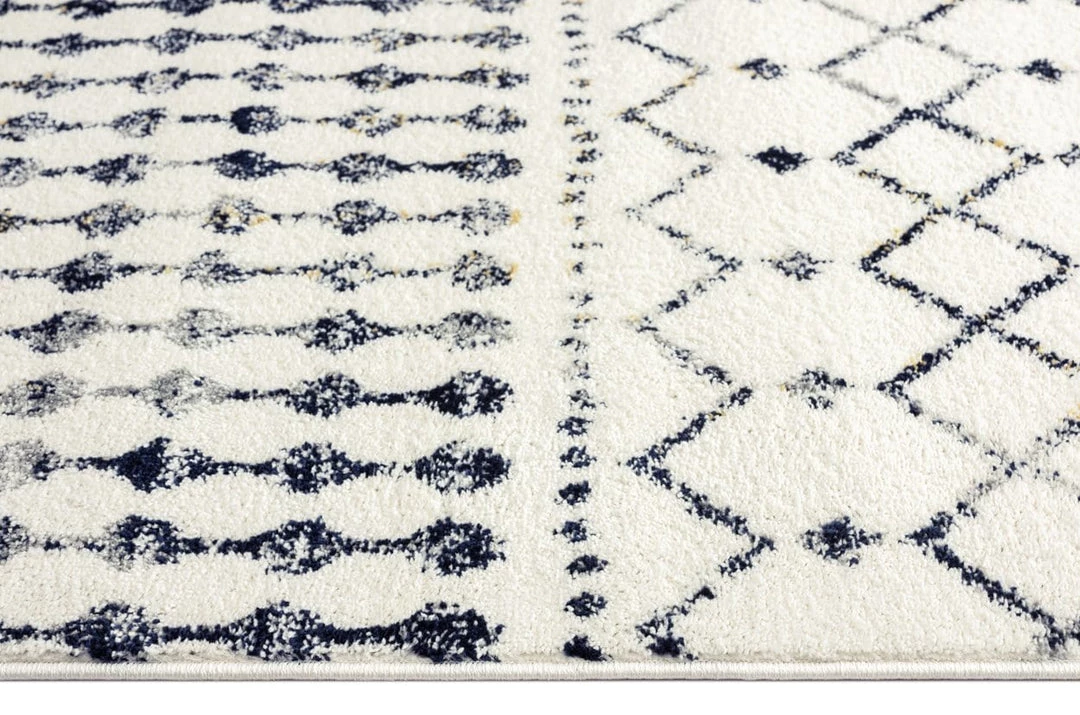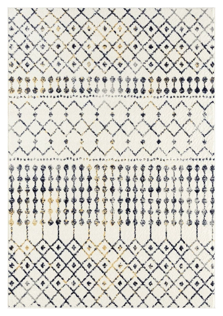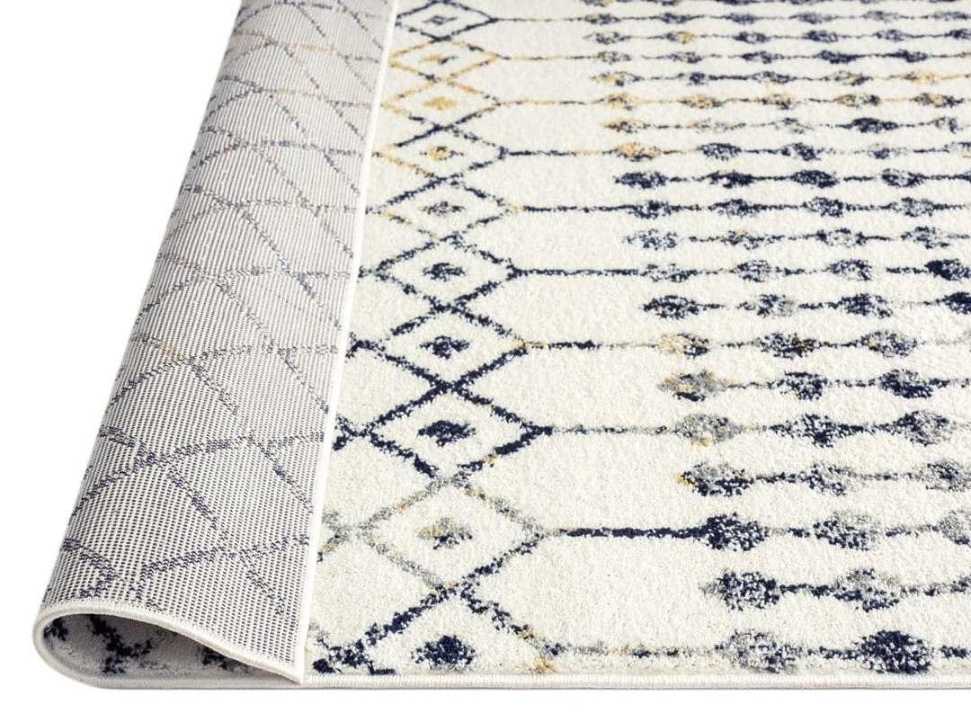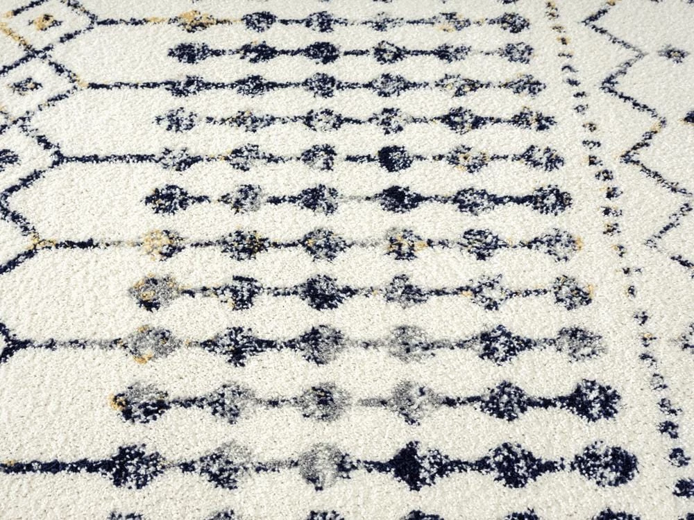 Molly is a beautiful cream blue and grey rug with a distressed lined diamond tribal pattern.
