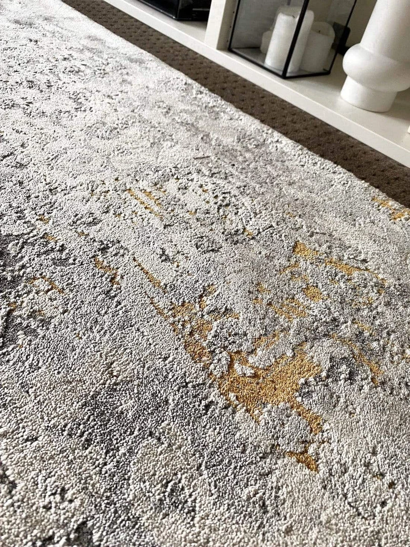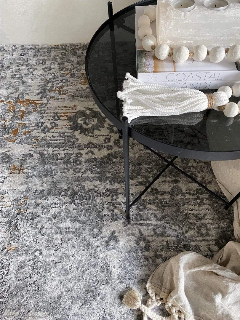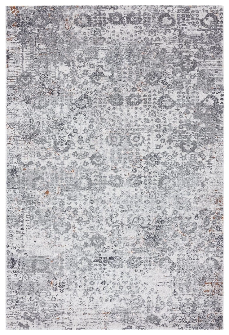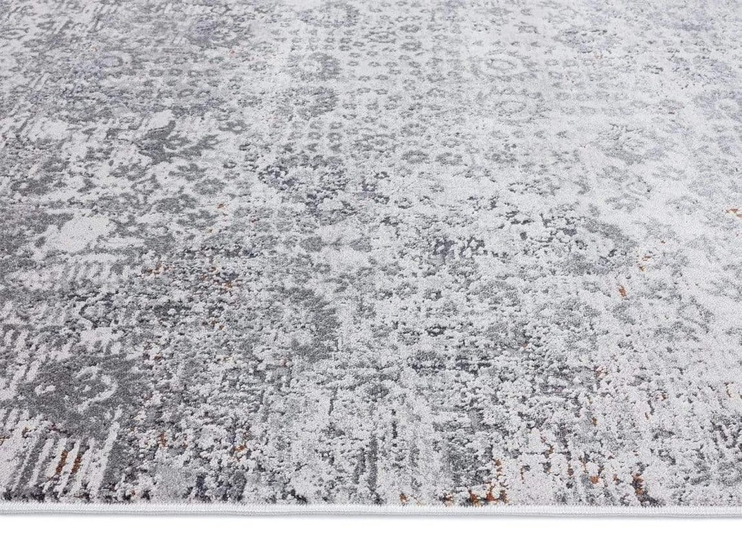 Ophelia is a sophisticated stone grey and ivory transitional distressed motif rug.