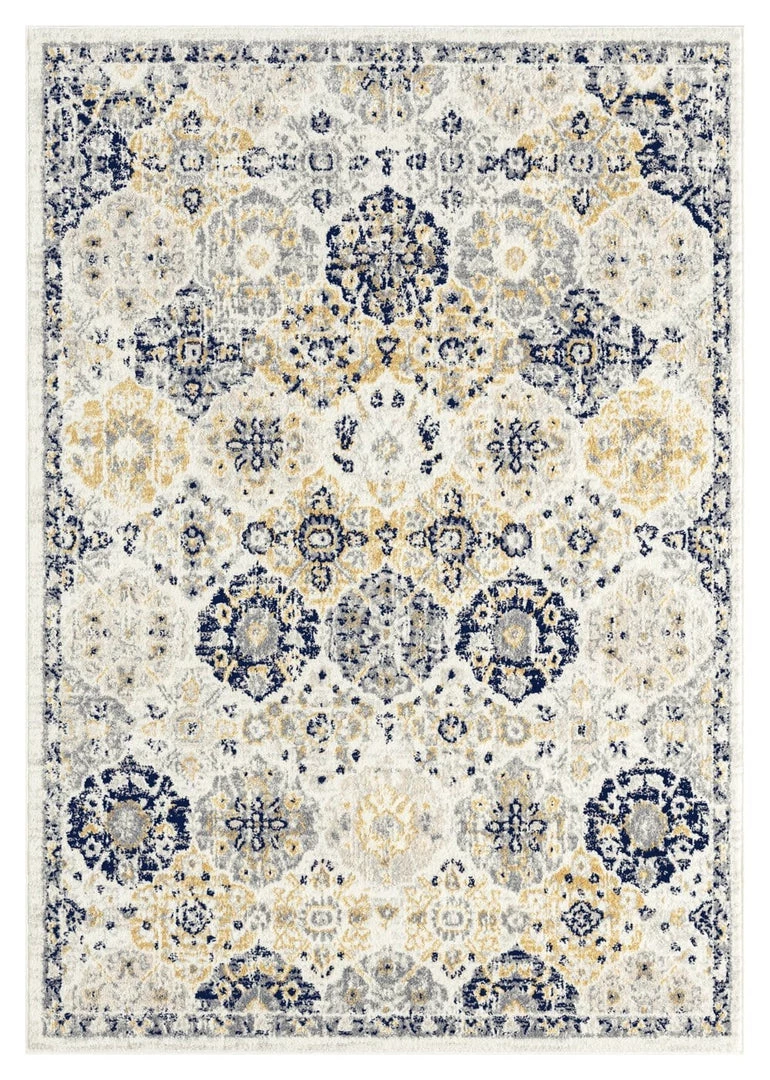 Priscilla is a lovely transitional yellow and navy blue traditional rug with a floral motif.