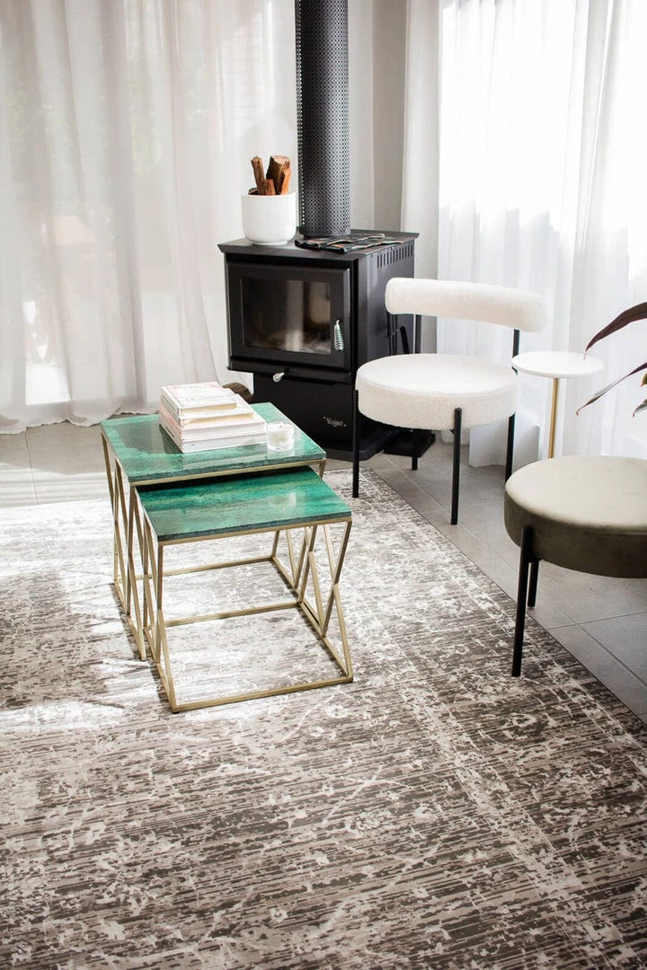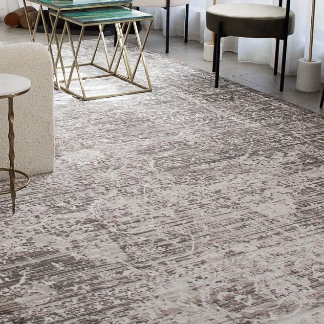 An exclusive design in the Miss Amara Collection, Raina is a bordered vintage distressed style. Decorated with elaborate floral motifs and ornate patterns in transitional multi-tones of ivory, cream and grey. A timeless and elegant addition to a modern, classic, bohemian or vintage space.