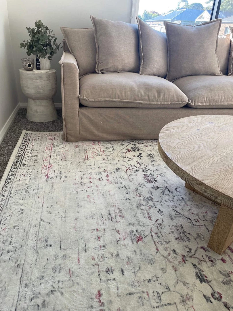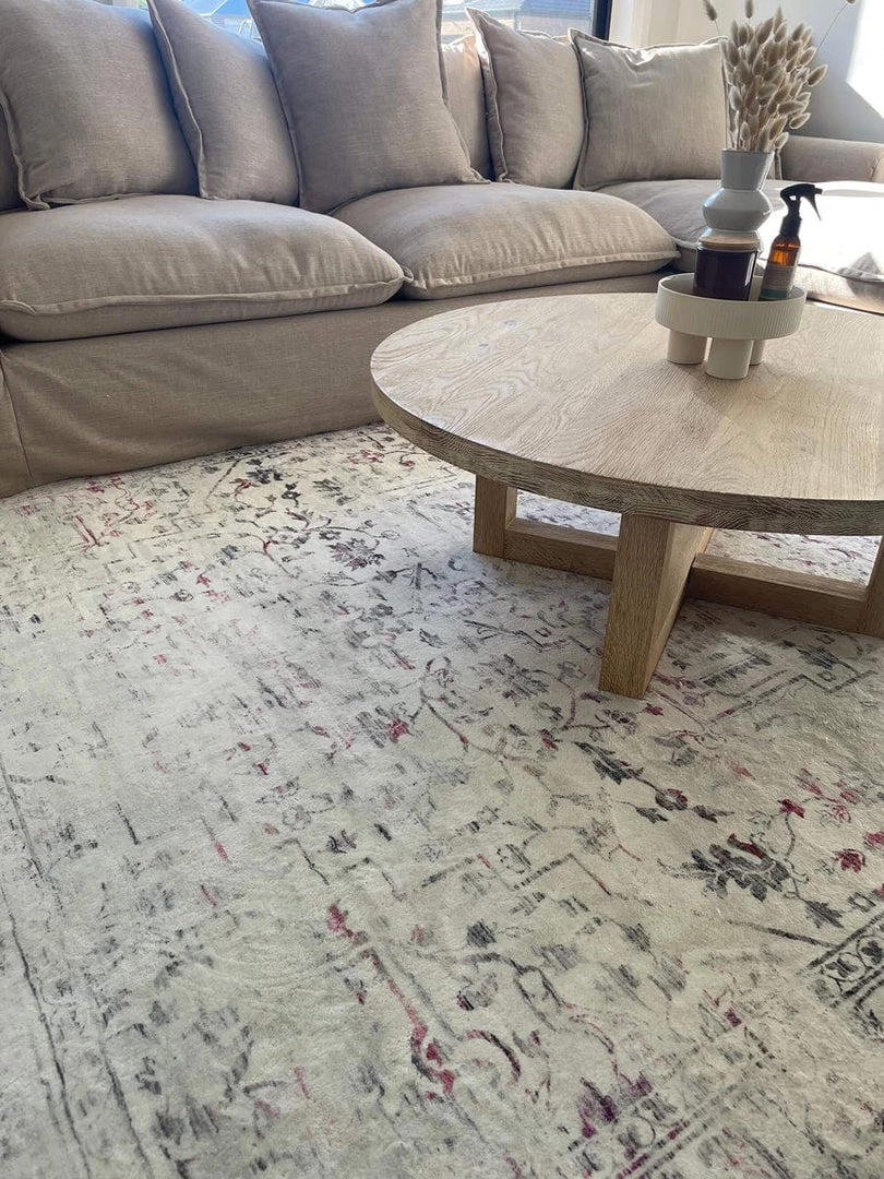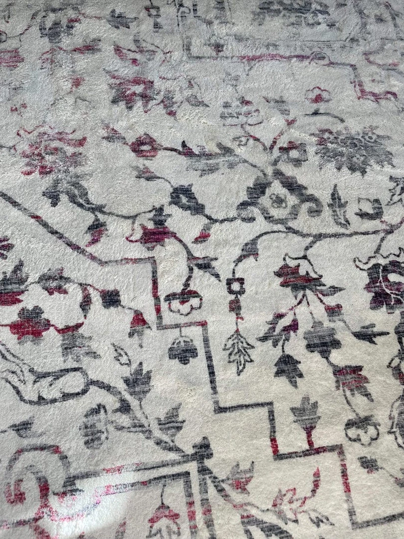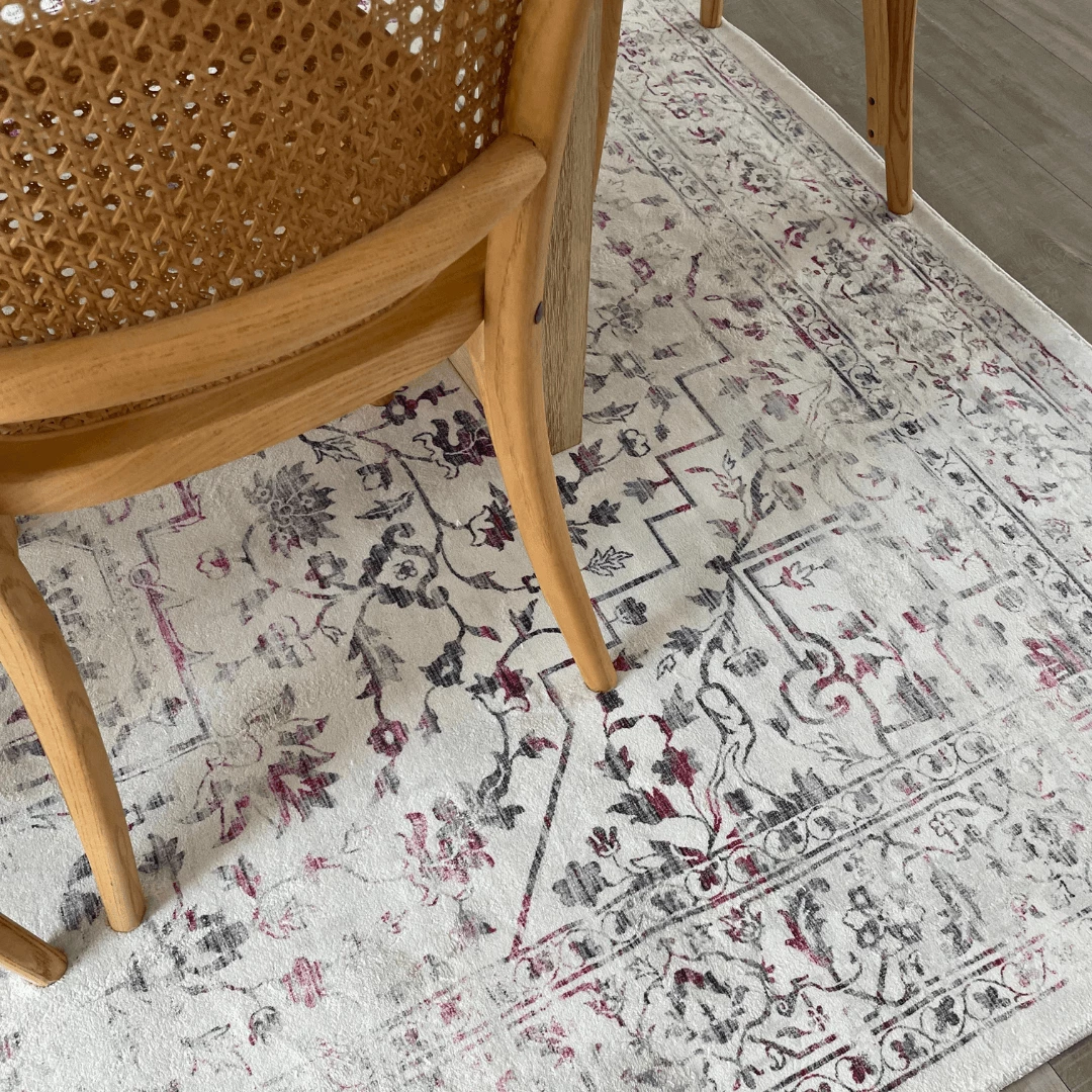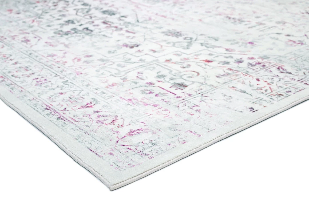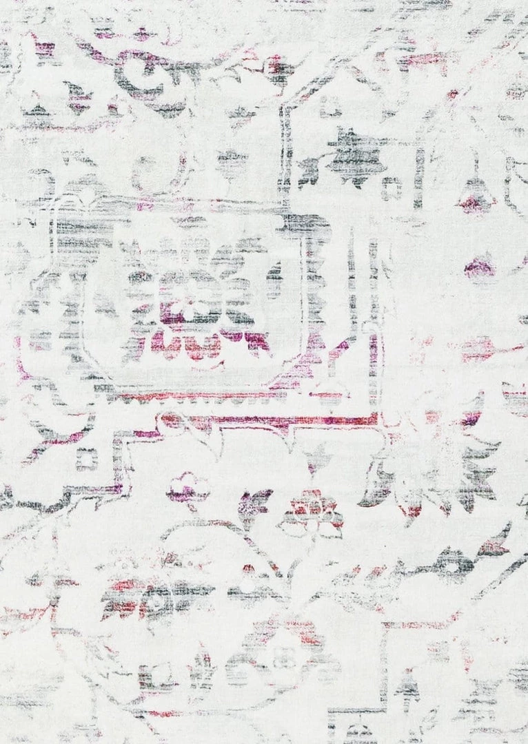 Decorated with elaborate floral motifs and ornate patterns in transitional tones of purple and grey on an ivory background. The beautiful pattern design is printed on top giving it a faded effect with a subtle vintage look. A timeless and elegant addition to a modern, classic, bohemian or vintage space.