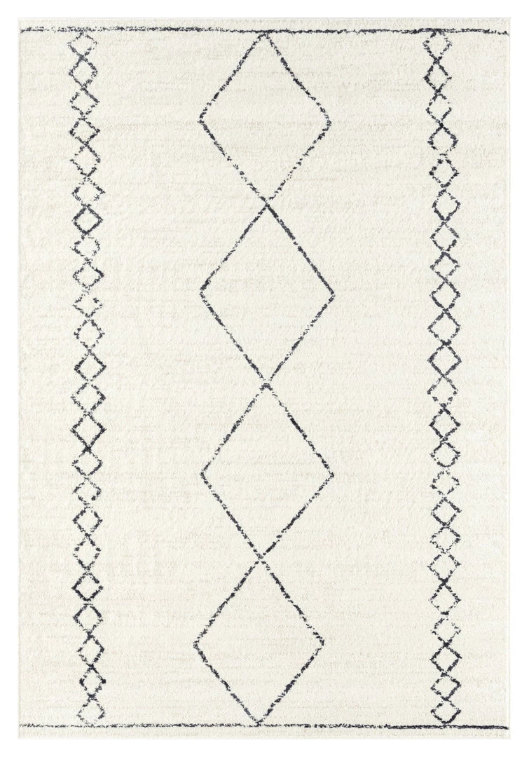 Tamira is a stunning minimal ivory and grey distressed transitional rug with a lined diamond tribal pattern.