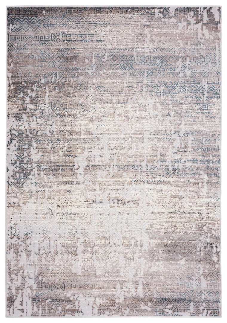 Tatara is a stunning grey rug with a distressed modern tribal print in ivory and brown with hints of teal blue.