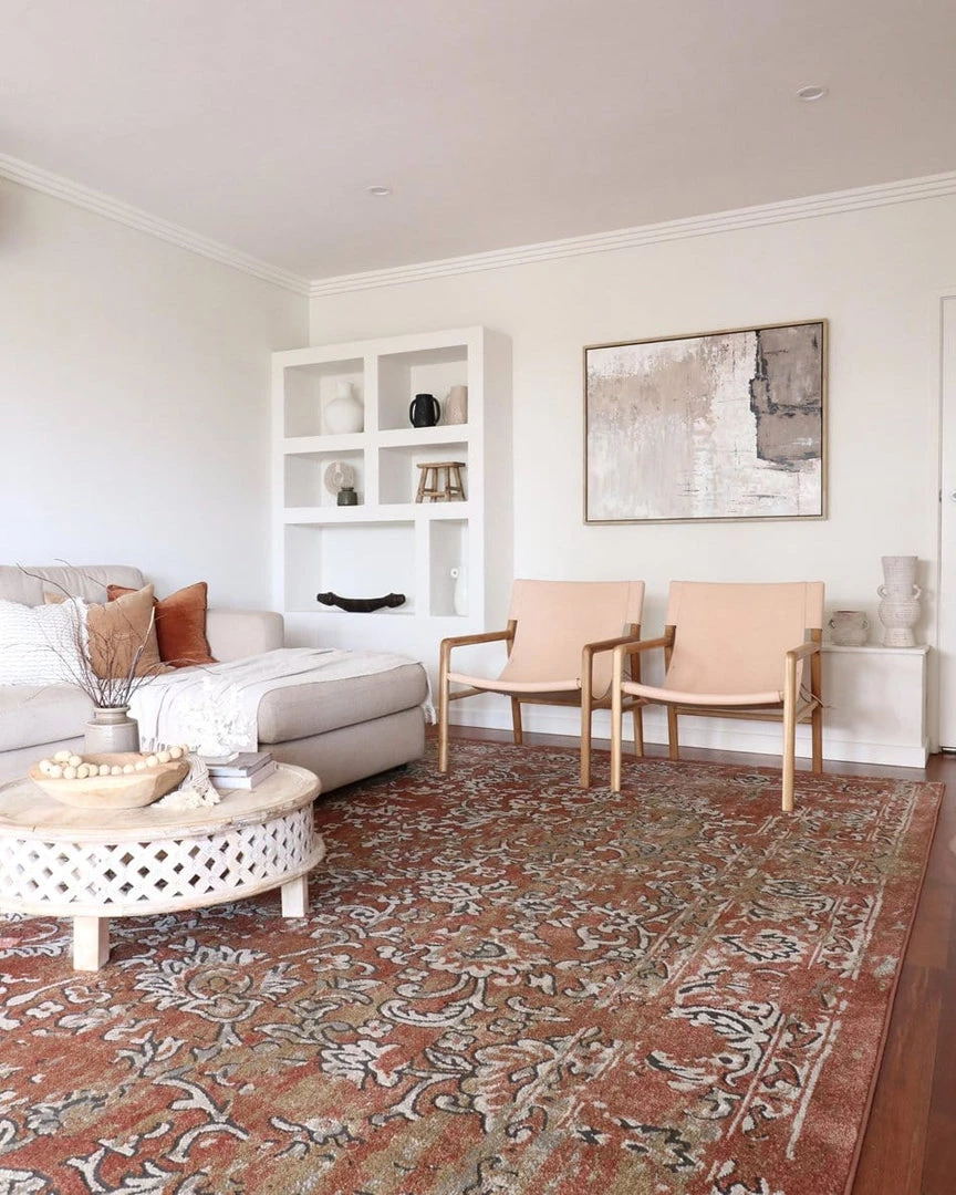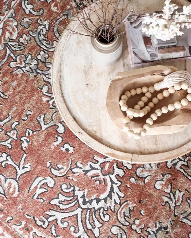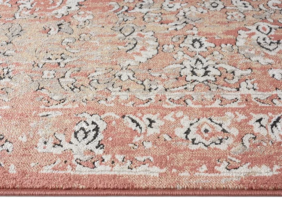 Yolanda is a beautiful peach, terracotta orange and ivory rug in a traditional distressed style with a floral motif.
