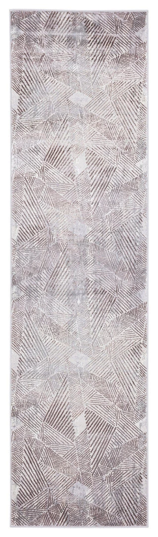 Zenia is a gorgeous grey runner rug with a distressed modern tribal print in ivory and brown.