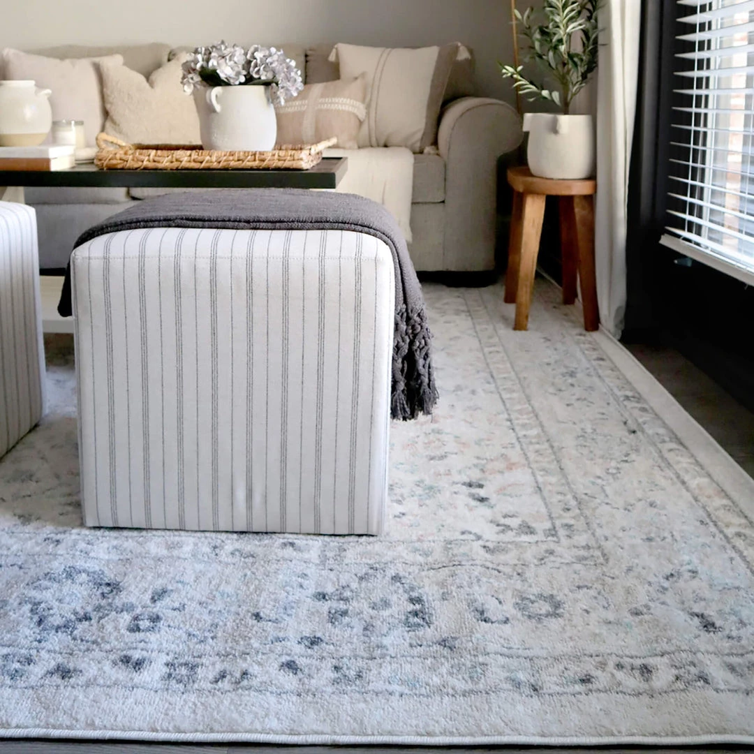 An exclusive design in the Miss Amara Collection, Anine is a bordered vintage distressed style. Decorated with elaborate floral motifs and ornate patterns in transitional multi-tones of ivory, grey, powder blue and pastel pink. A timeless and elegant addition to a modern, classic, bohemian or vintage space.