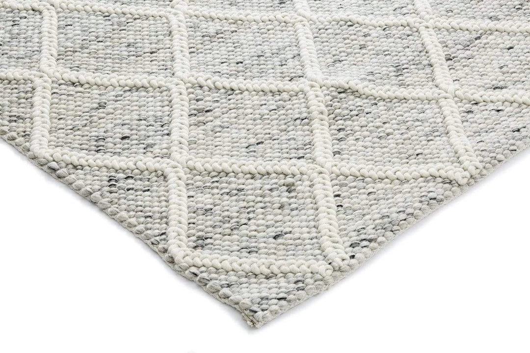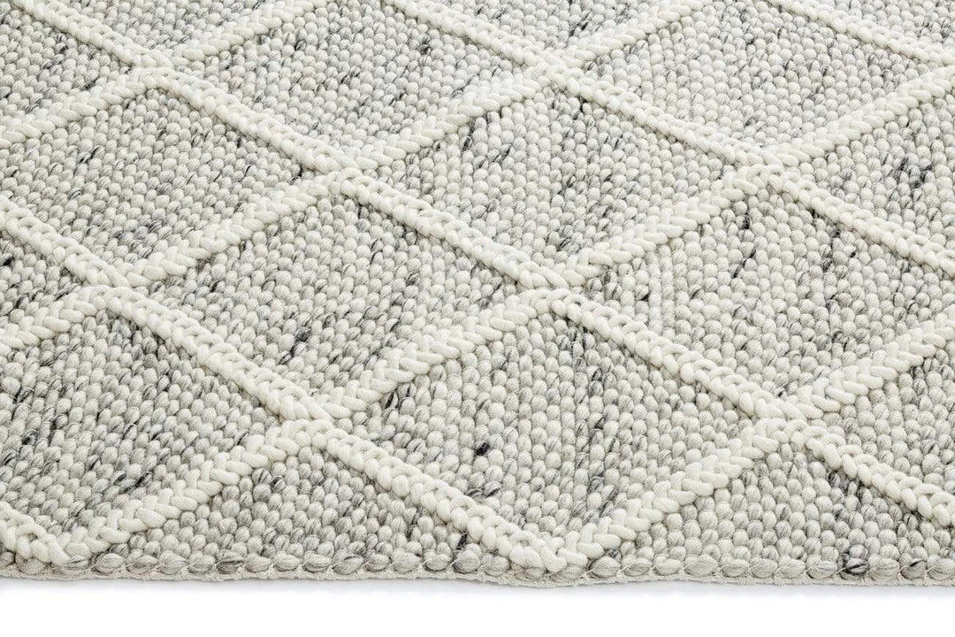 Designed exclusively for the Miss Amara Collection, Anja is a marbled grey and ivory flatweave wool rug with a simple diamond lattice pattern. Set against a backdrop of marbled grey wool, Anja features a braided diamond pattern in contrasting ivory for a three-dimensional effect and gorgeous texture.