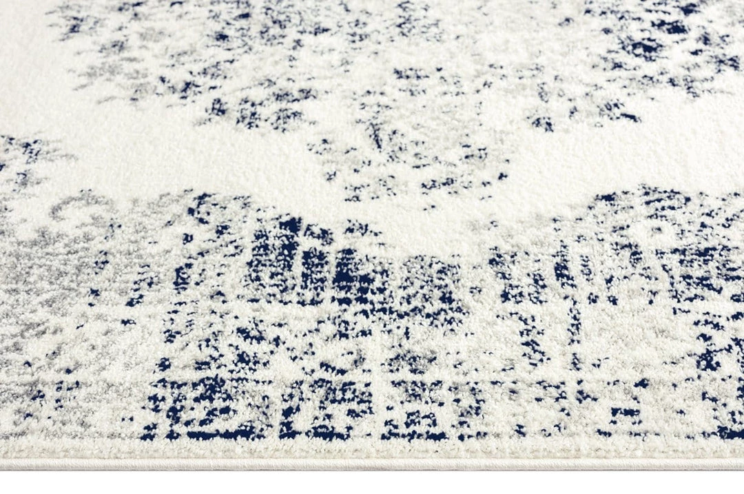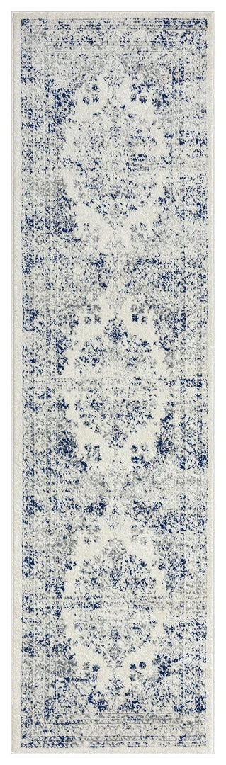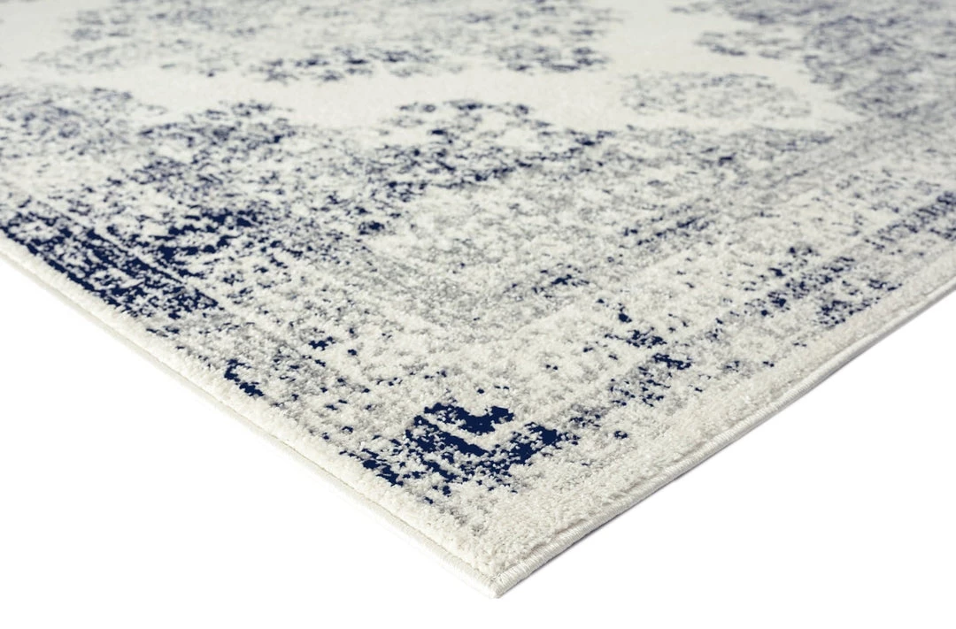 Ansa is a stunning navy blue, grey and ivory traditional floral medallion rug with a cream background.