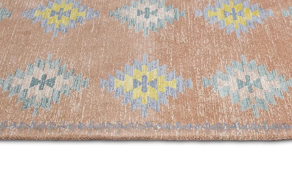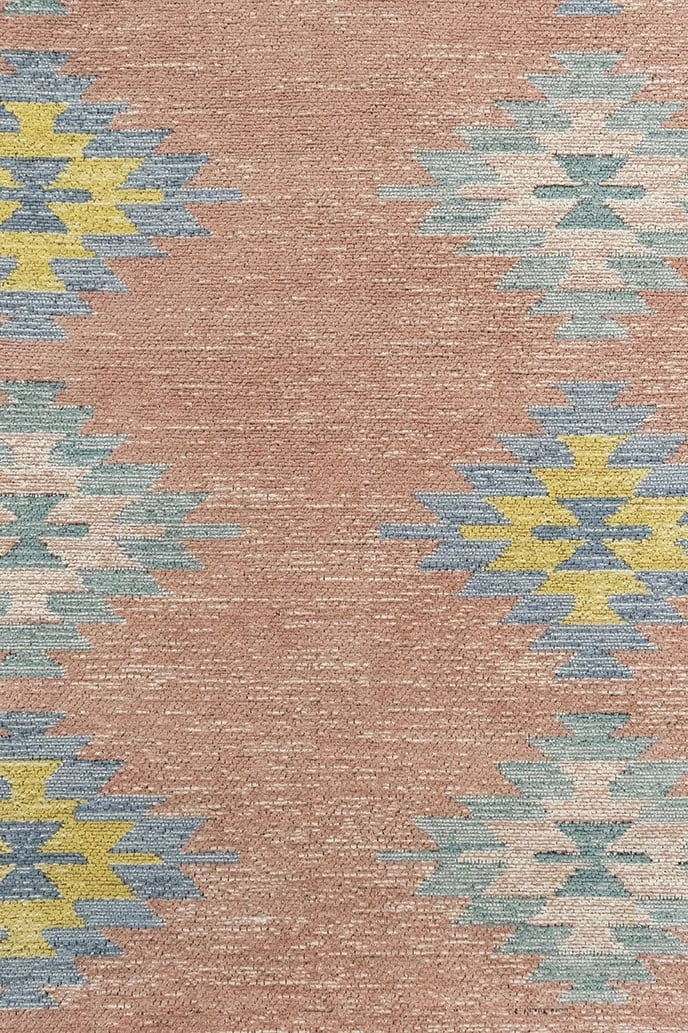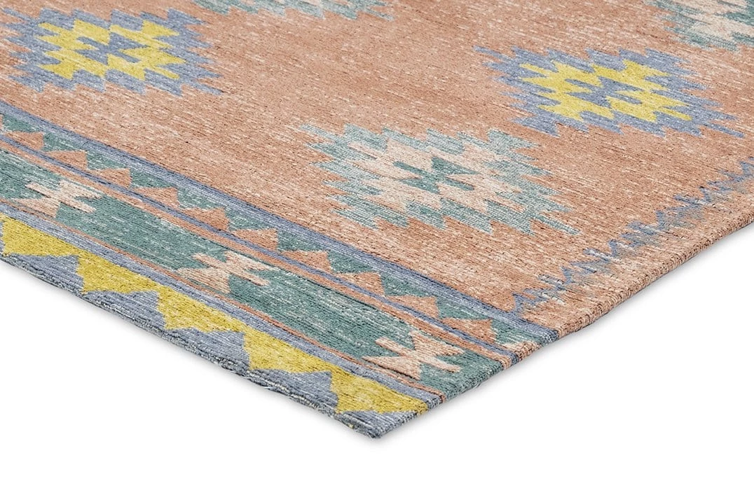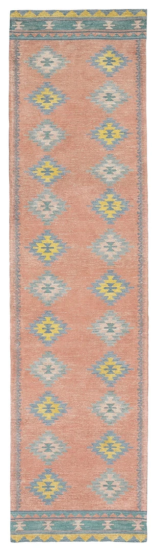 Ariel is a stunning peach runner rug with a bordered tribal pattern in multi-tones of blue and yellow.