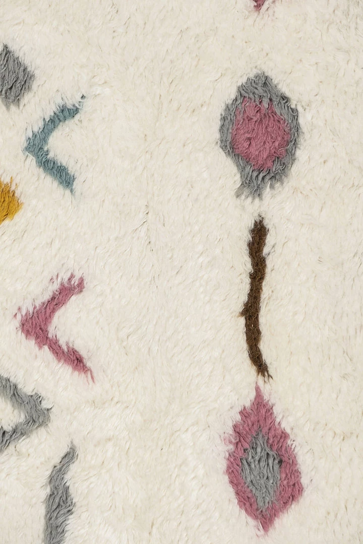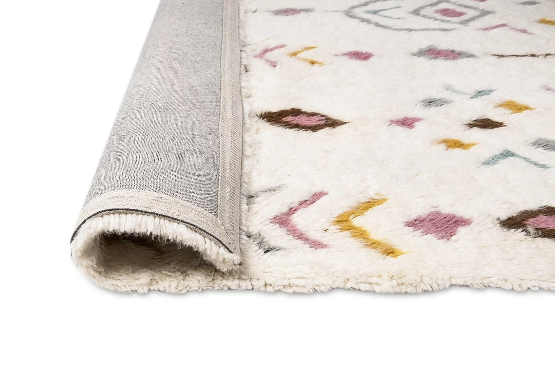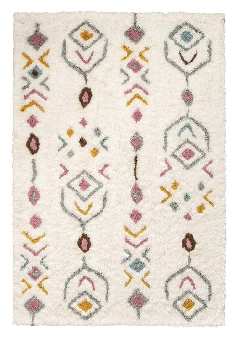 Chikita is a lovely multi-colour wool shag rug with a unique tribal pattern in tones of pastel pink, blue, mustard yellow and grey on a background of natural ivory.