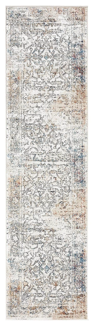 Constance is a gorgeous blue and beige multi-toned runner rug in a traditional distressed style with a bordered floral motif.