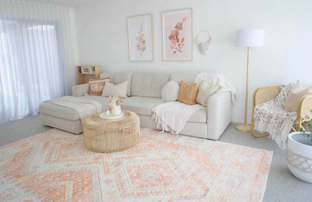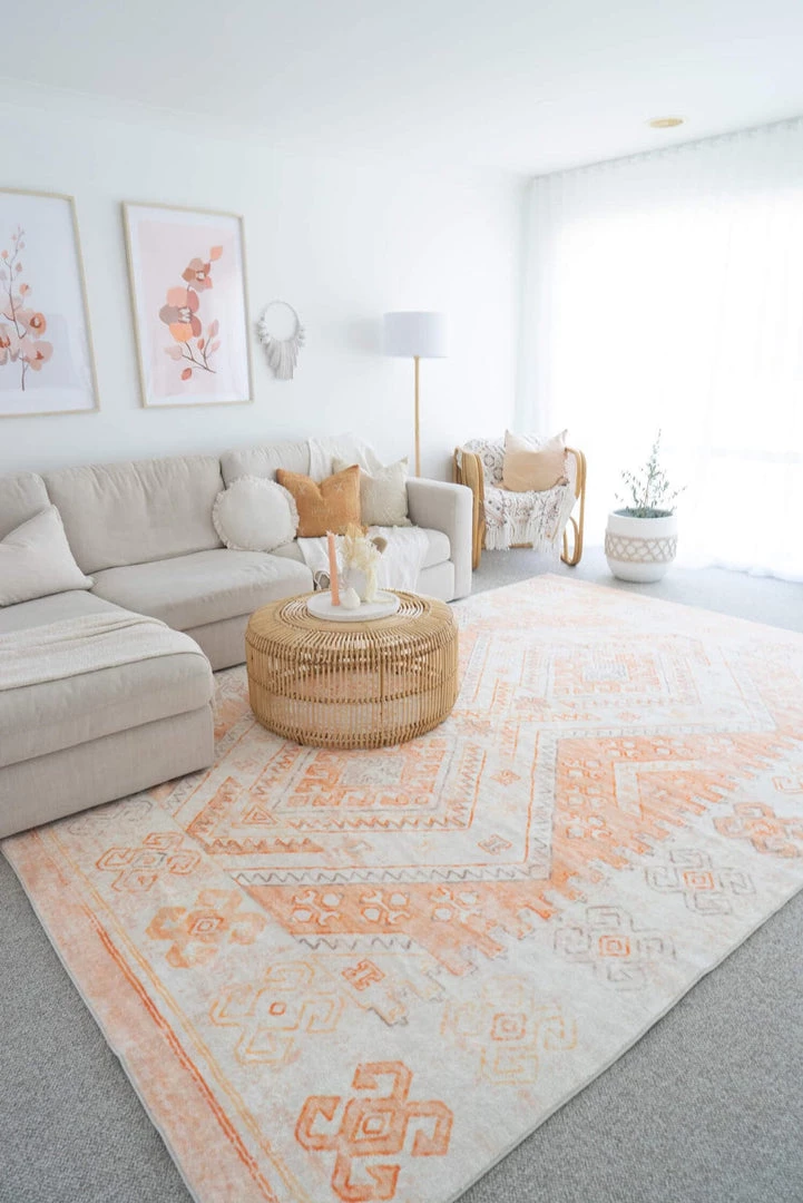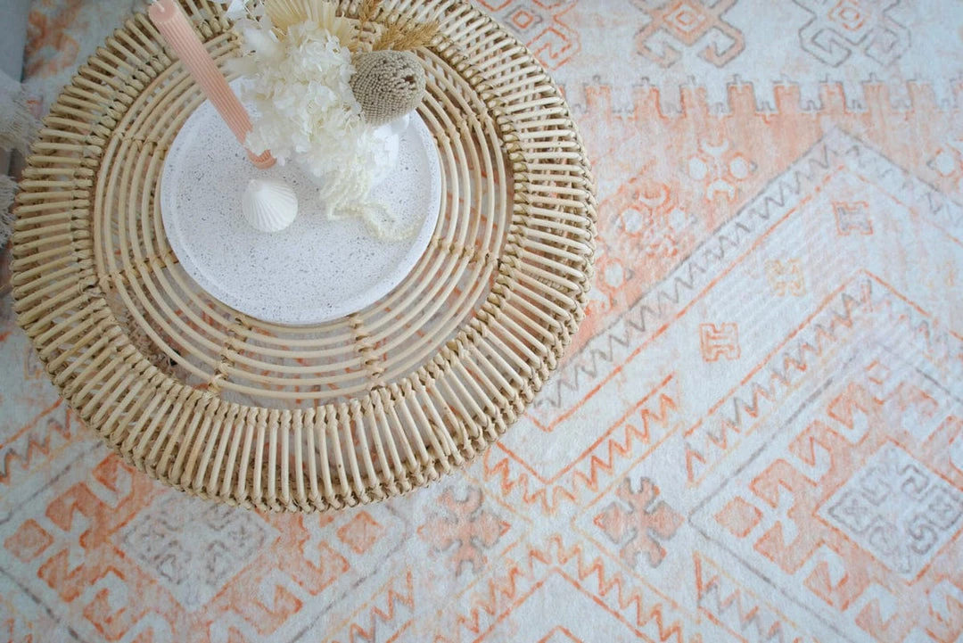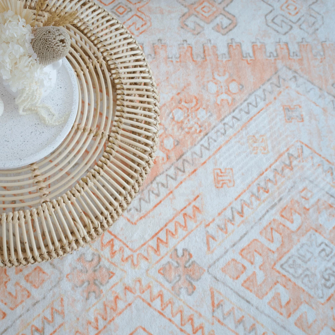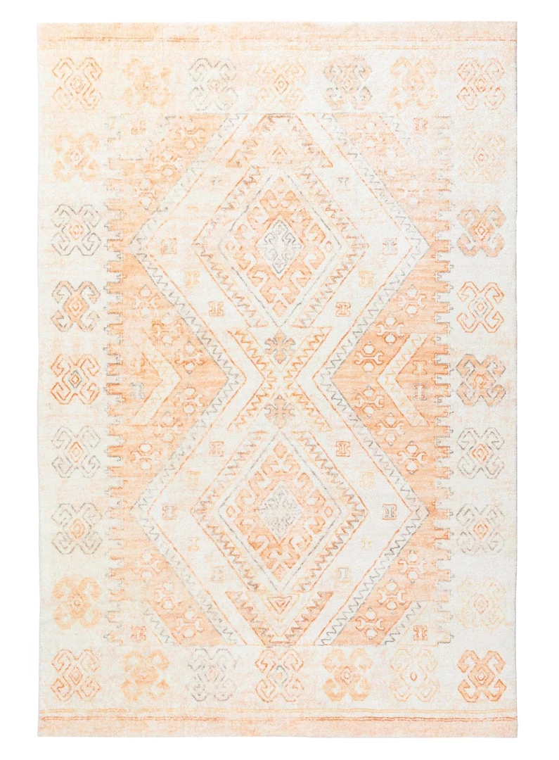 A warm apricot palette of orange, peach and cream tones with subtle hints of beige. The beautiful tribal design is printed on top of the fibres giving it a faded effect with a subtle vintage distressed look. A timeless and elegant addition to a modern, tribal, bohemian or vintage space.