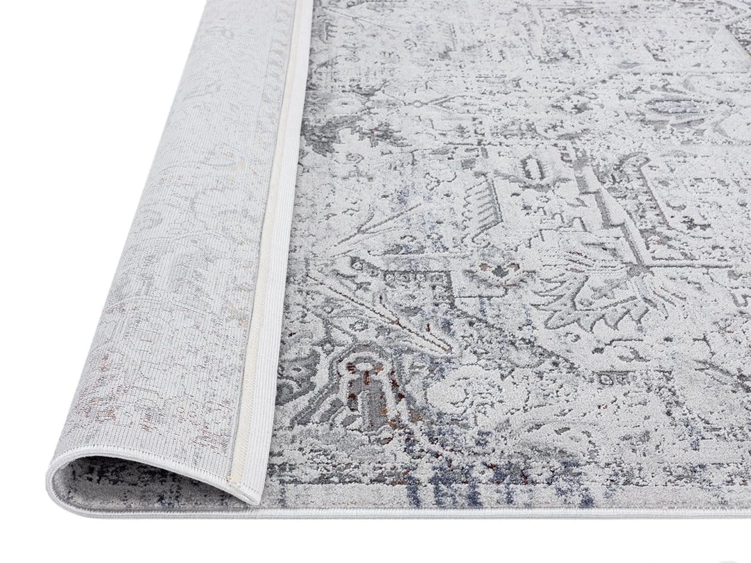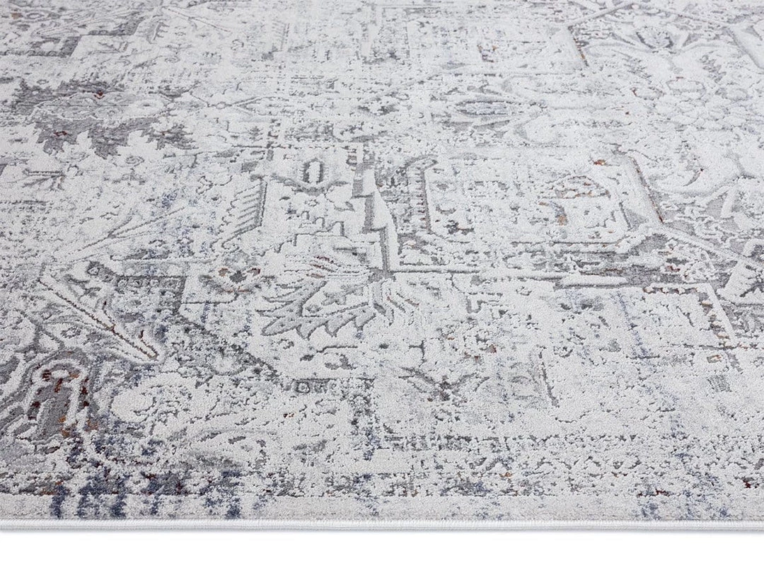 Inspired by traditional rug styles in a timeless transitional colour palette of grey and blue with hints of rust bronze in distressed medallion design. Created from a variety of carved pile, this subtle raised pattern adds an extra-dimensional effect to the look.