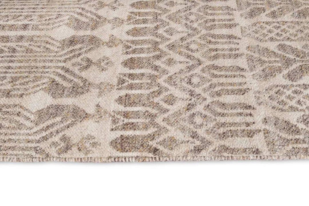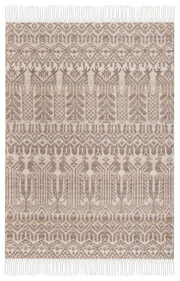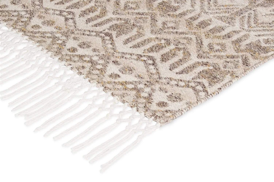 Elyse is a stunning beige and grey rug with a tribal-inspired pattern adorned with ivory tassels.