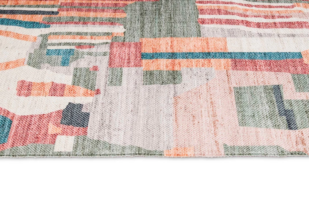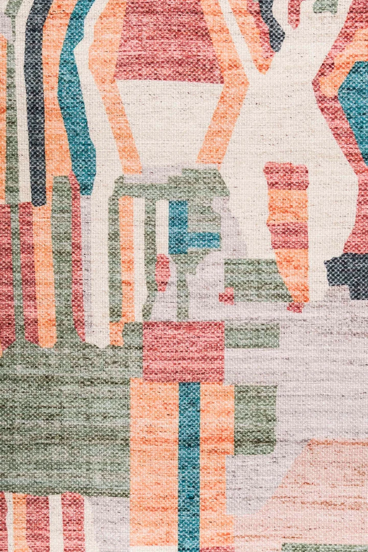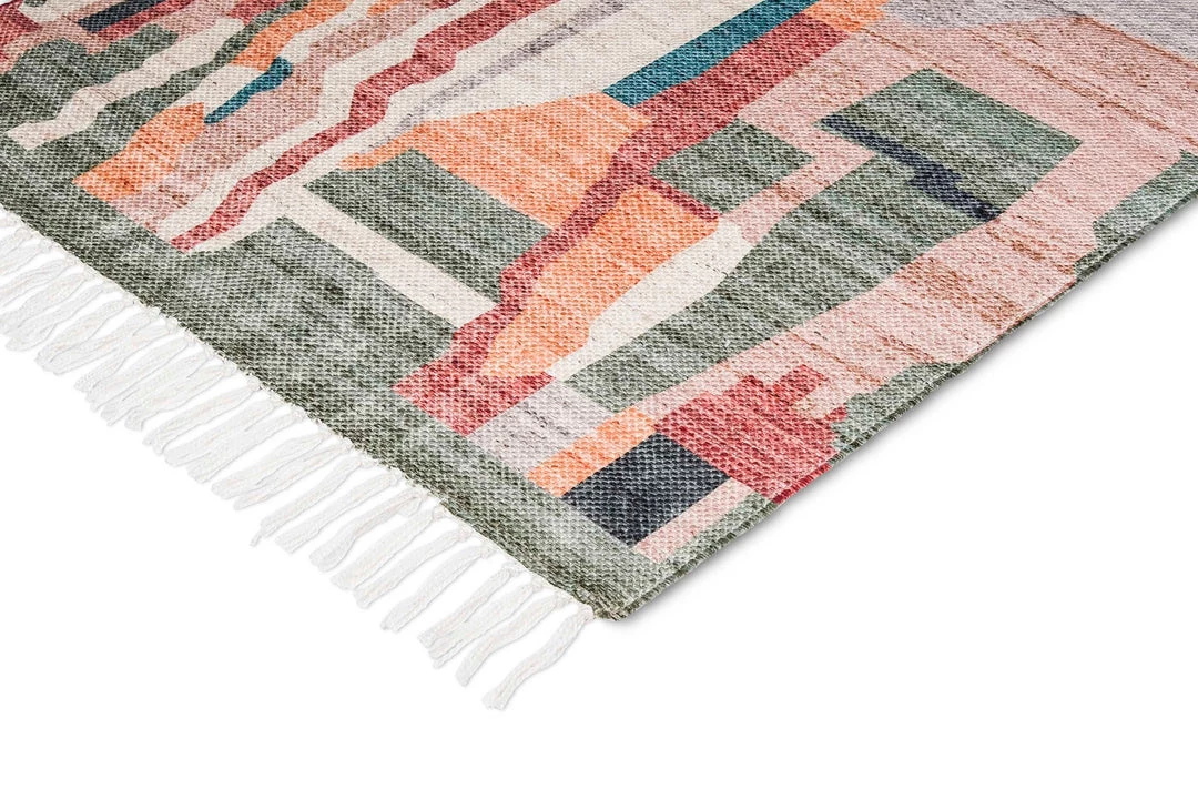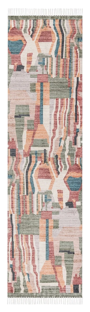 Fern is a lovely multi-colour PET runner rug with a brown-grey background topped with a warm modern palette of green, orange, red and blue tones.