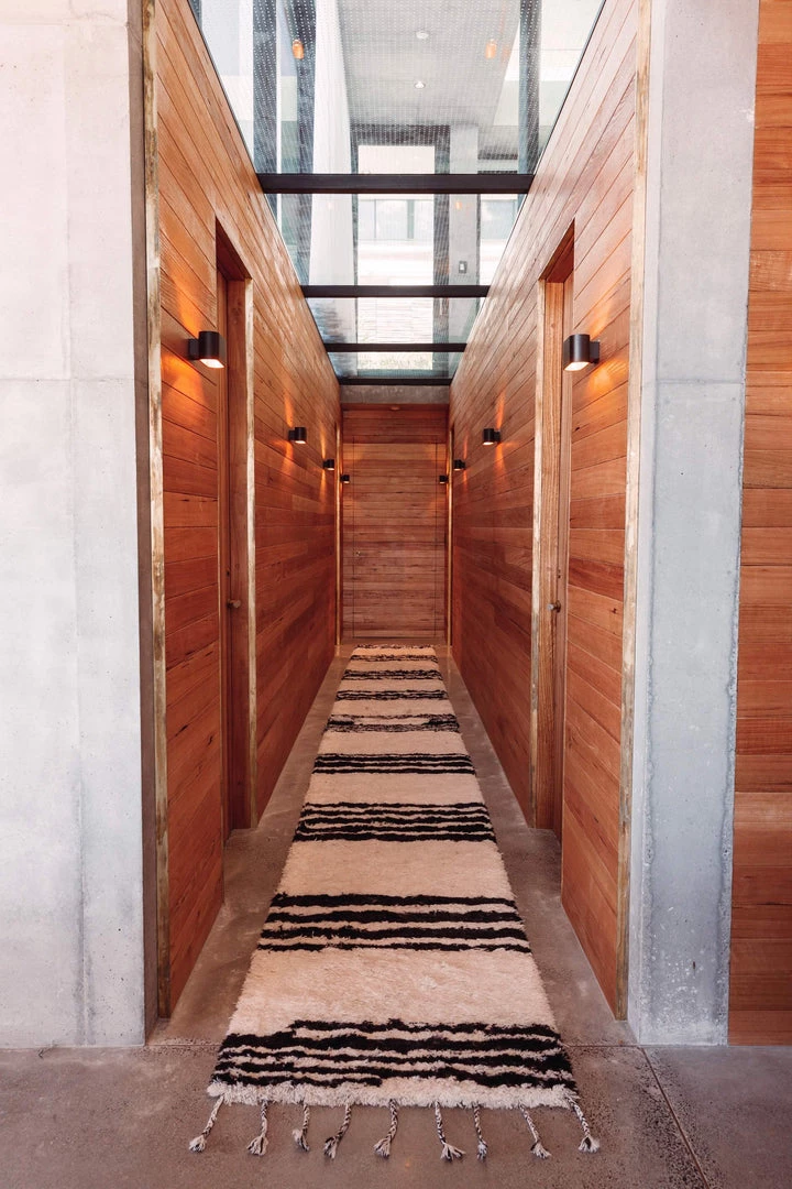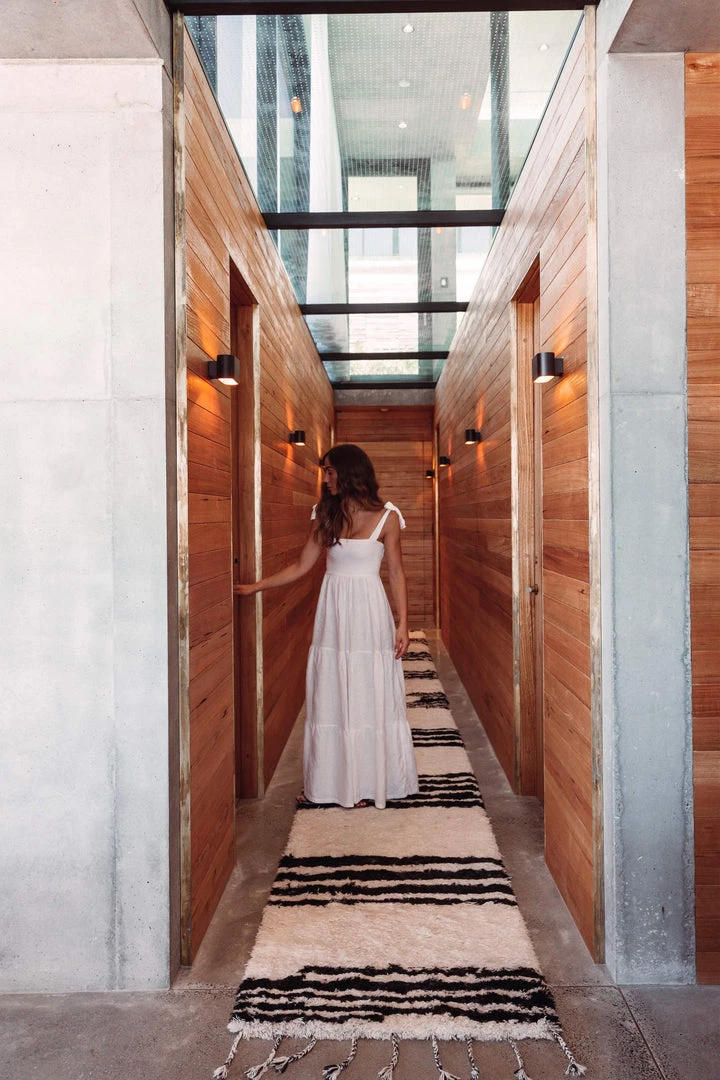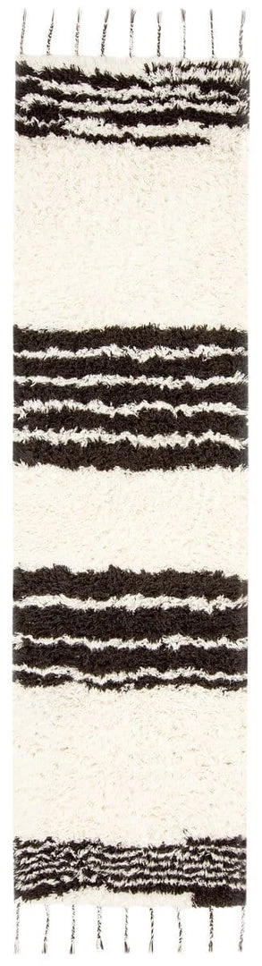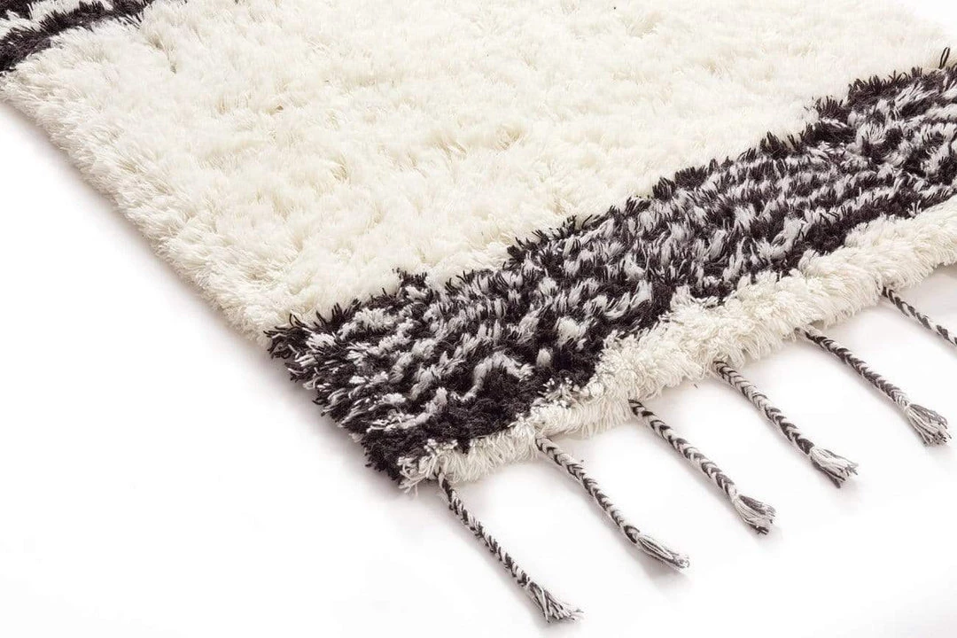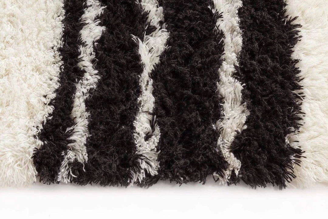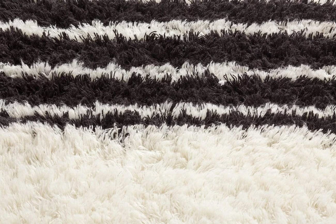 The perfect way to add a sense of tactile luxury to your home, Jamila is a luscious Berber style runner rug featuring a fluffy pile of wool fibres in a natural ivory colour and simple striped pattern in contrasting black.