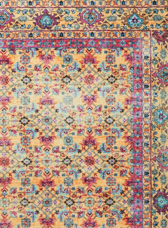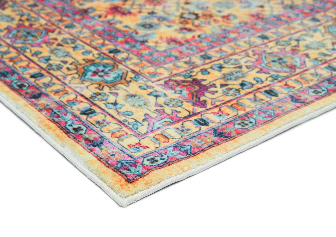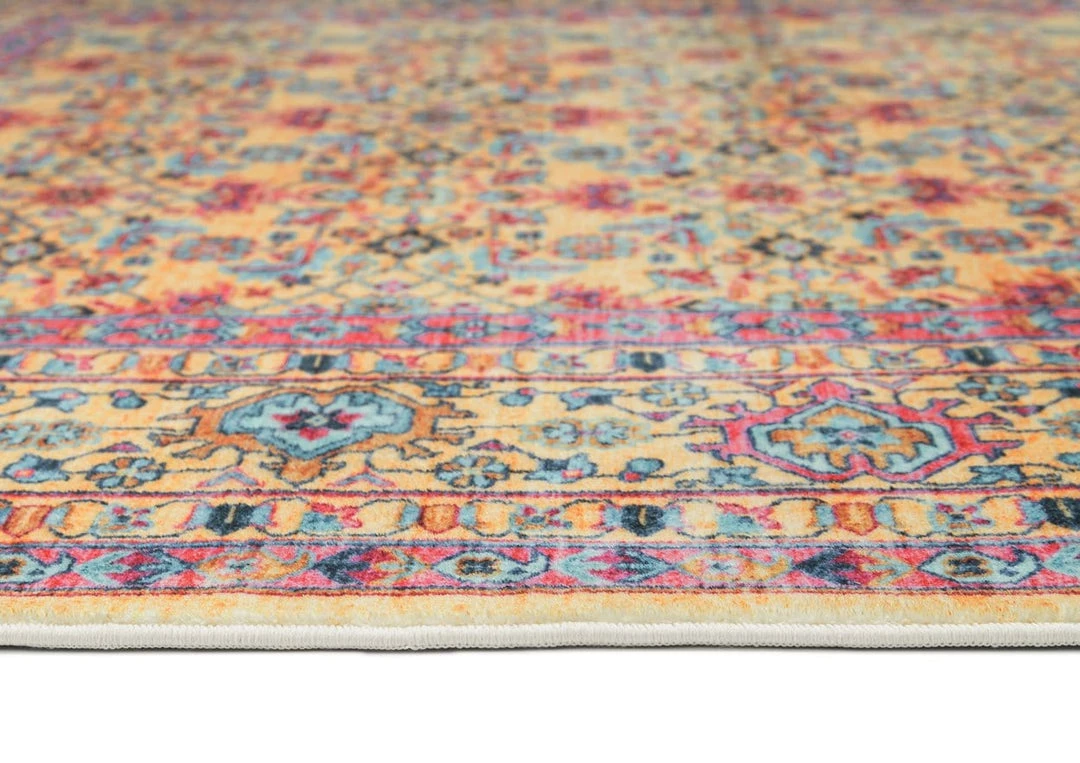 A gorgeous traditional bordered style topped with elaborate floral motifs and patterns with pops of pink, orange and blue colours. The beautiful pattern and colours are printed on top giving it a faded effect with a subtle vintage look. A timeless and elegant addition to a modern, classic, bohemian or vintage space.