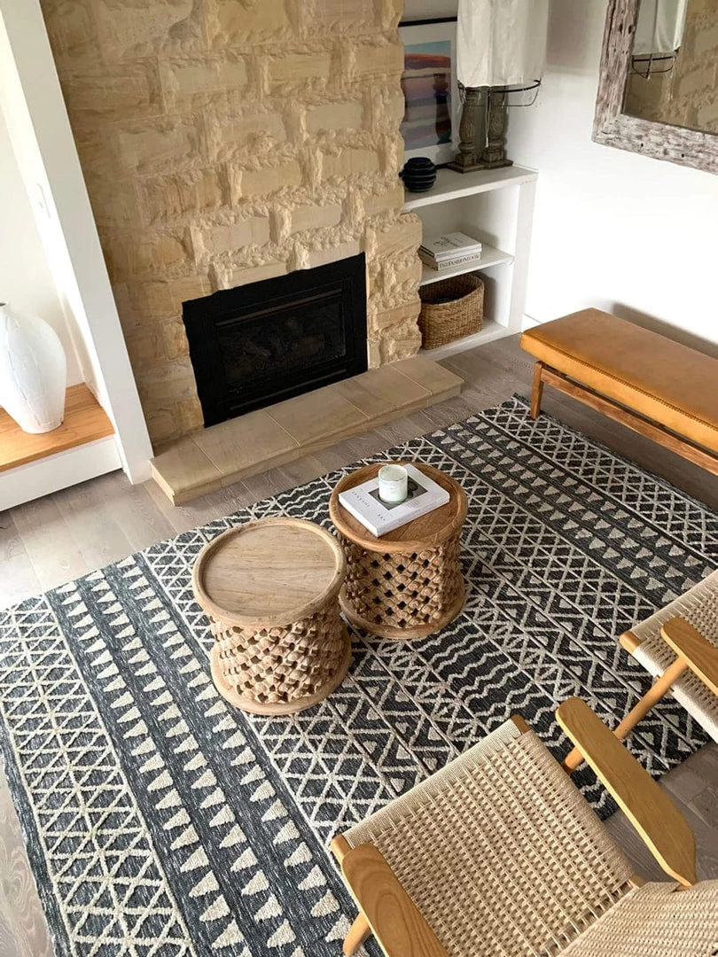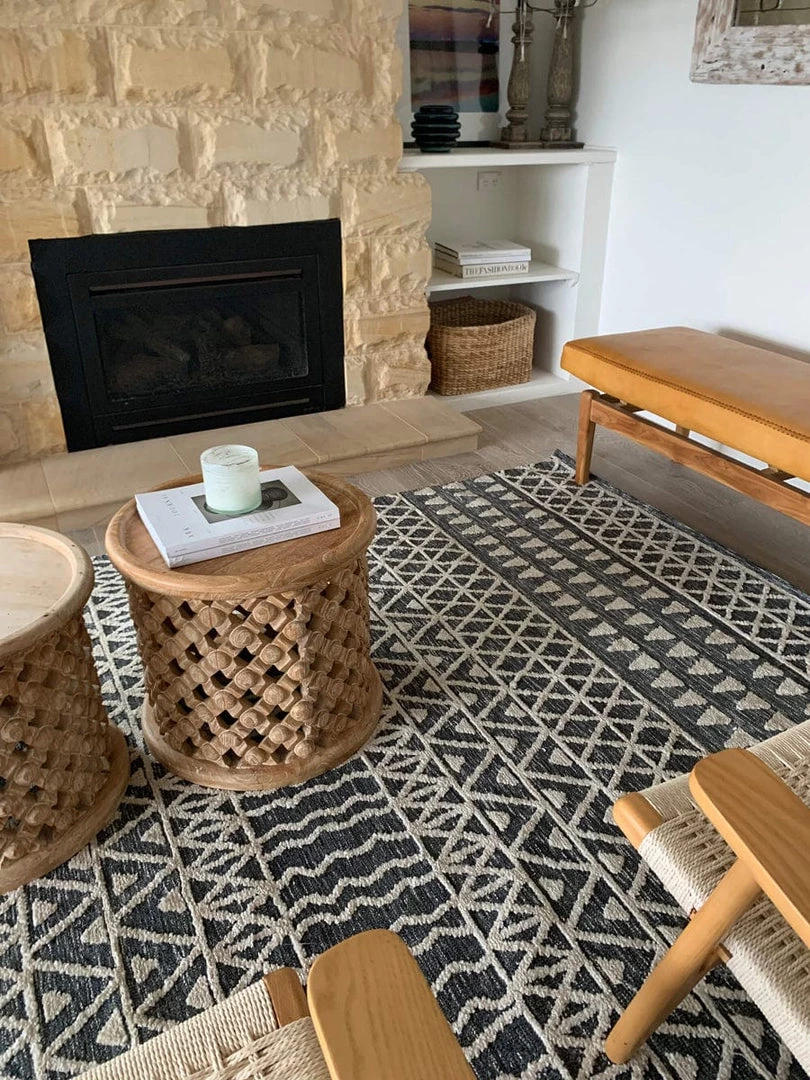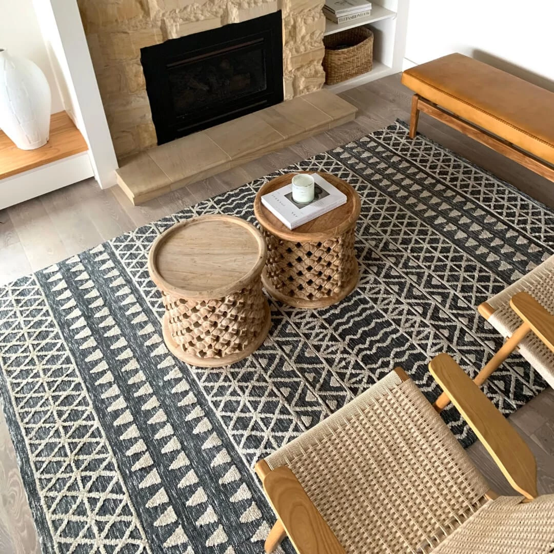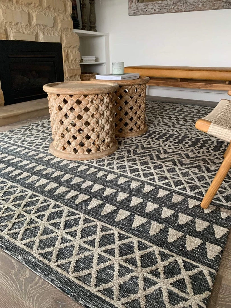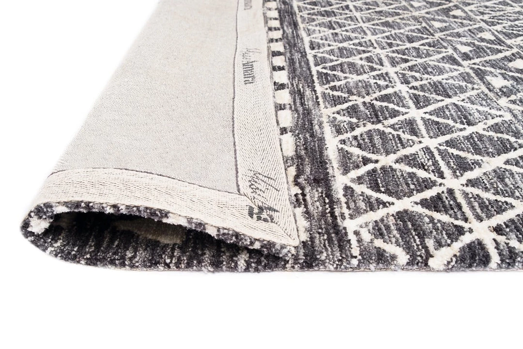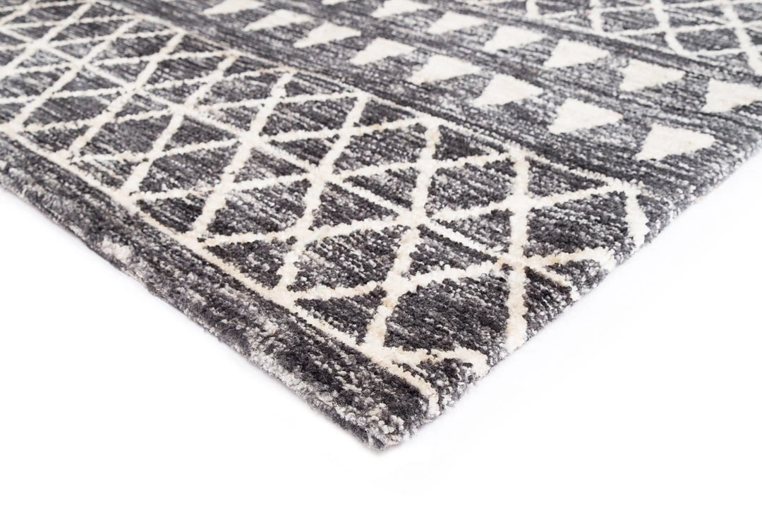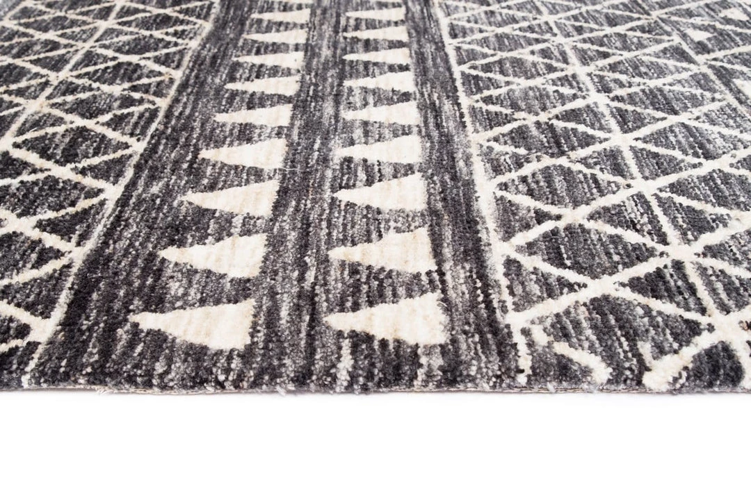 Kailani is a striking charcoal grey based rug with a diamond tribal print in multi-tones of ivory and cream.