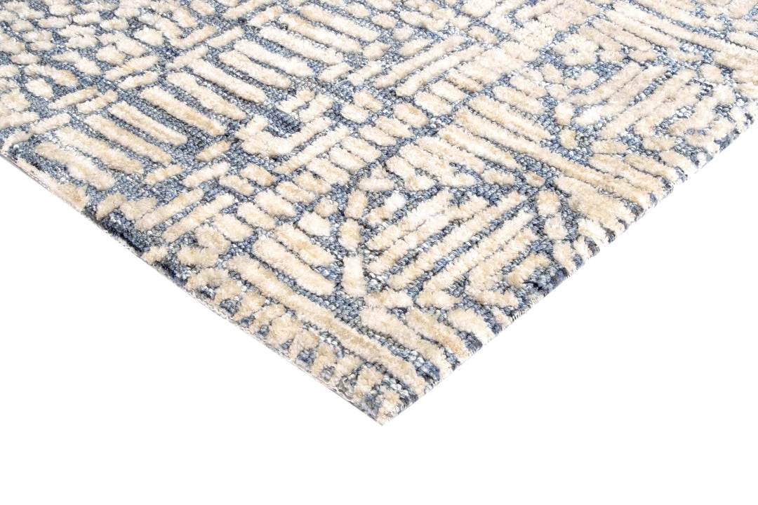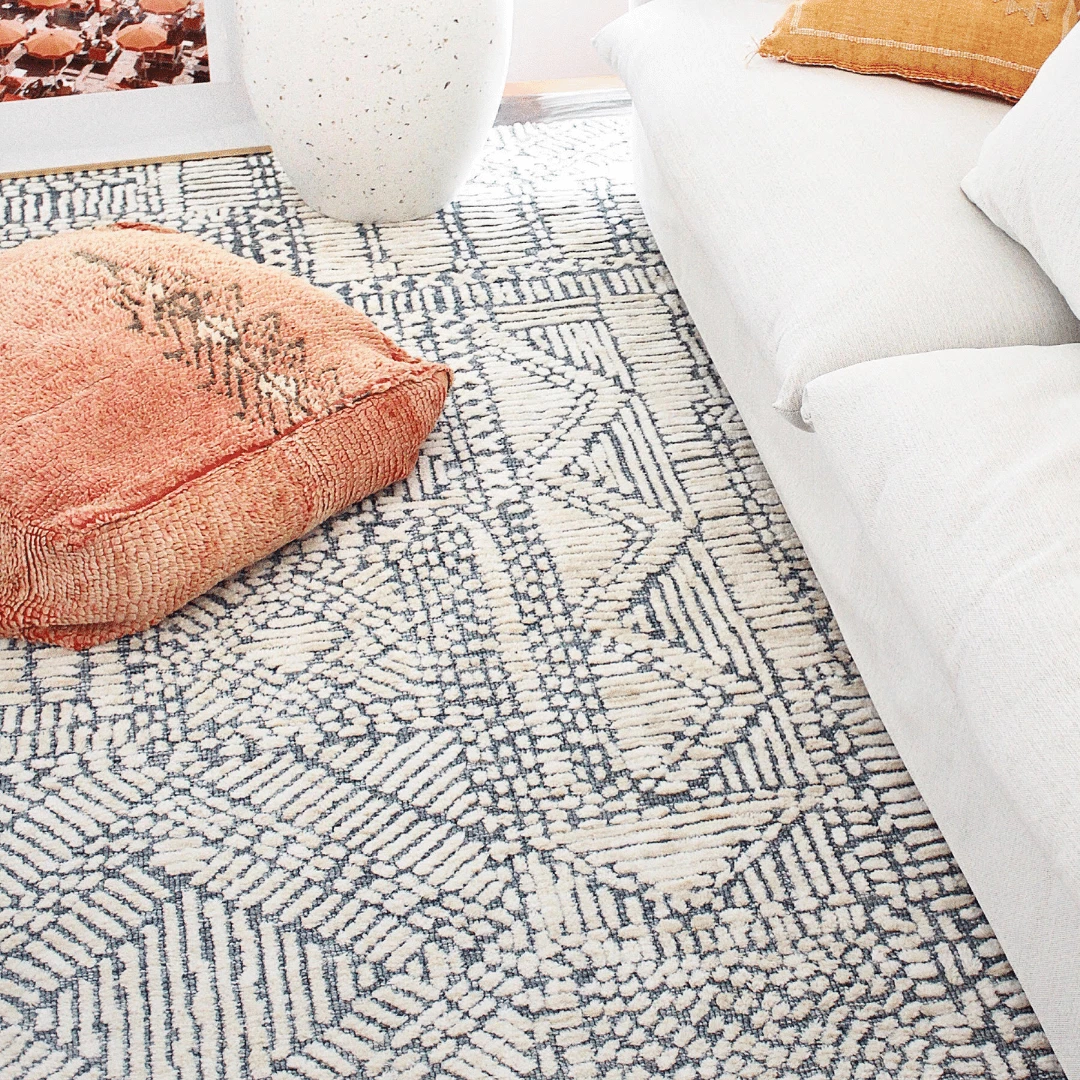 Karmen is a striking warm ivory textured rug with a tribal geometric pattern on a rich navy blue background.