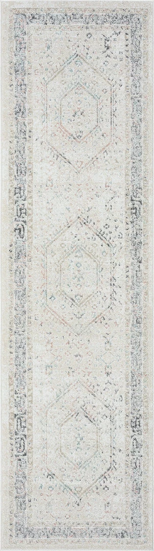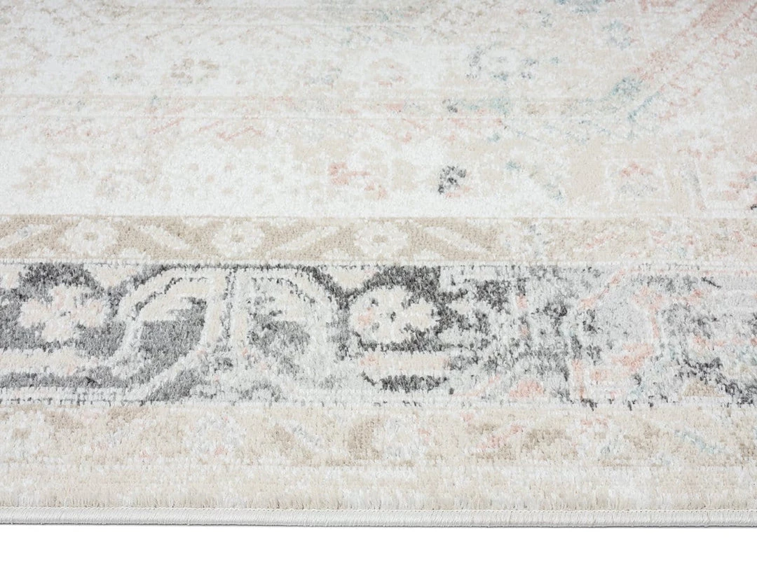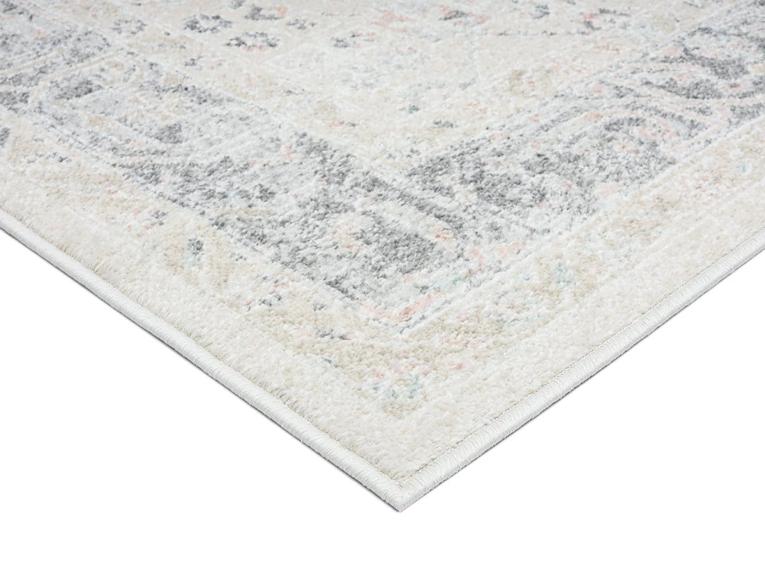 An exclusive design in the Miss Amara Collection, Katya is a bordered vintage distressed style. Decorated with elaborate floral motifs and ornate patterns in transitional multi-tones of ivory, grey, powder blue and pastel pink. A timeless and elegant addition to a modern, classic, bohemian or vintage space.