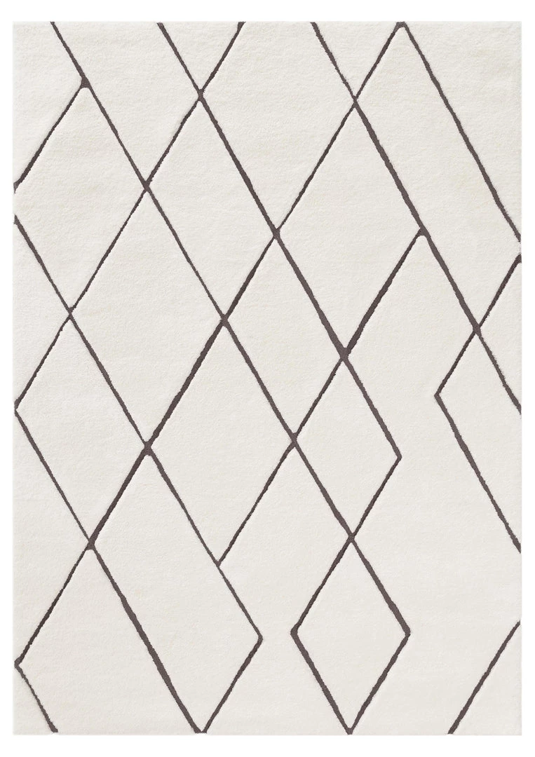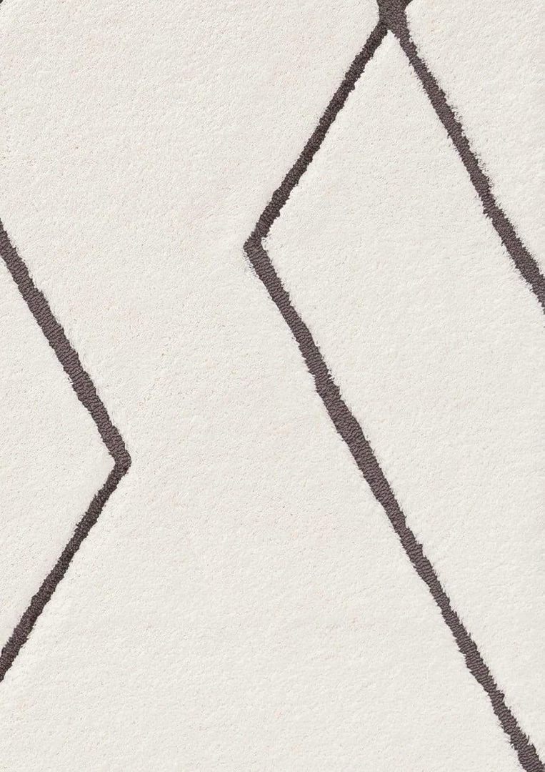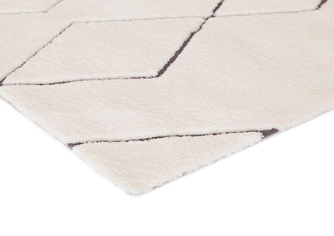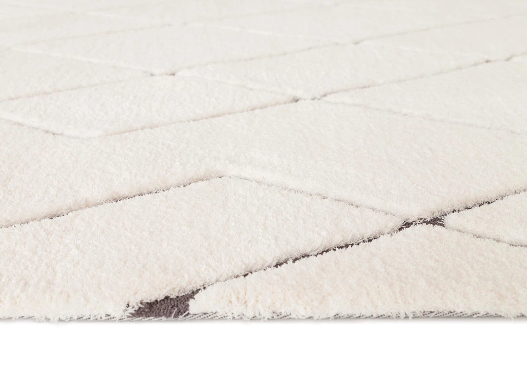 Kayla is a beautiful carved shag rug, featuring a blend of cream complemented by an abstract tribal pattern in charcoal grey.