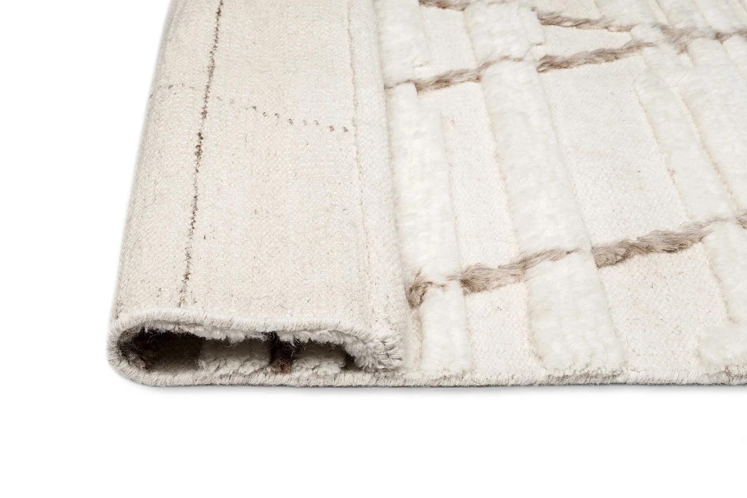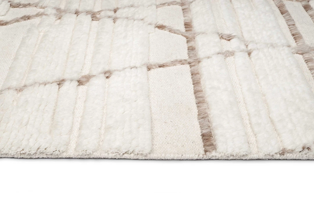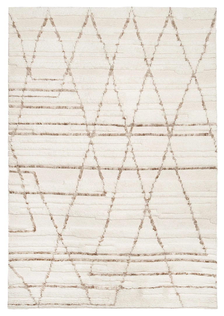 Leona is a stunning textured wool rug featuring the natural tones of blended ivory and beige, complemented by a contrasting lined tribal pattern in brown beige.