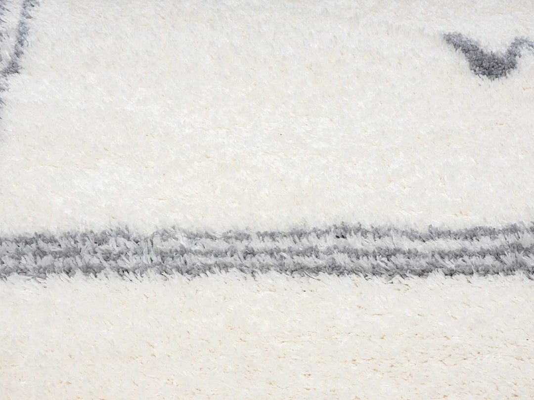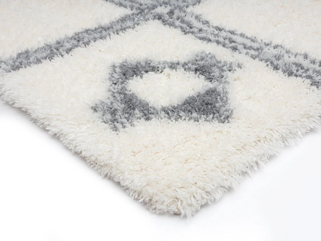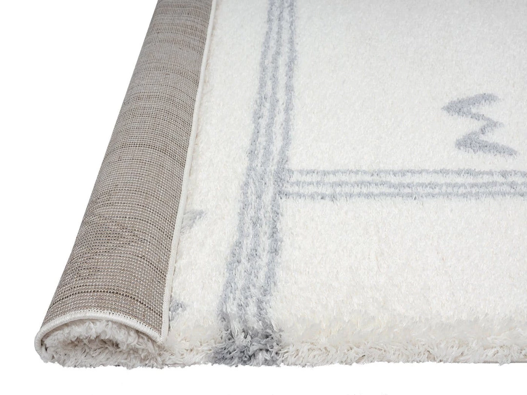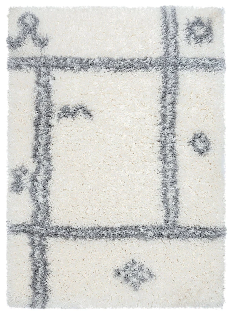Makara is a beautiful ivory shag style indoor mat with a minimal tribal pattern in multi-tones of grey.