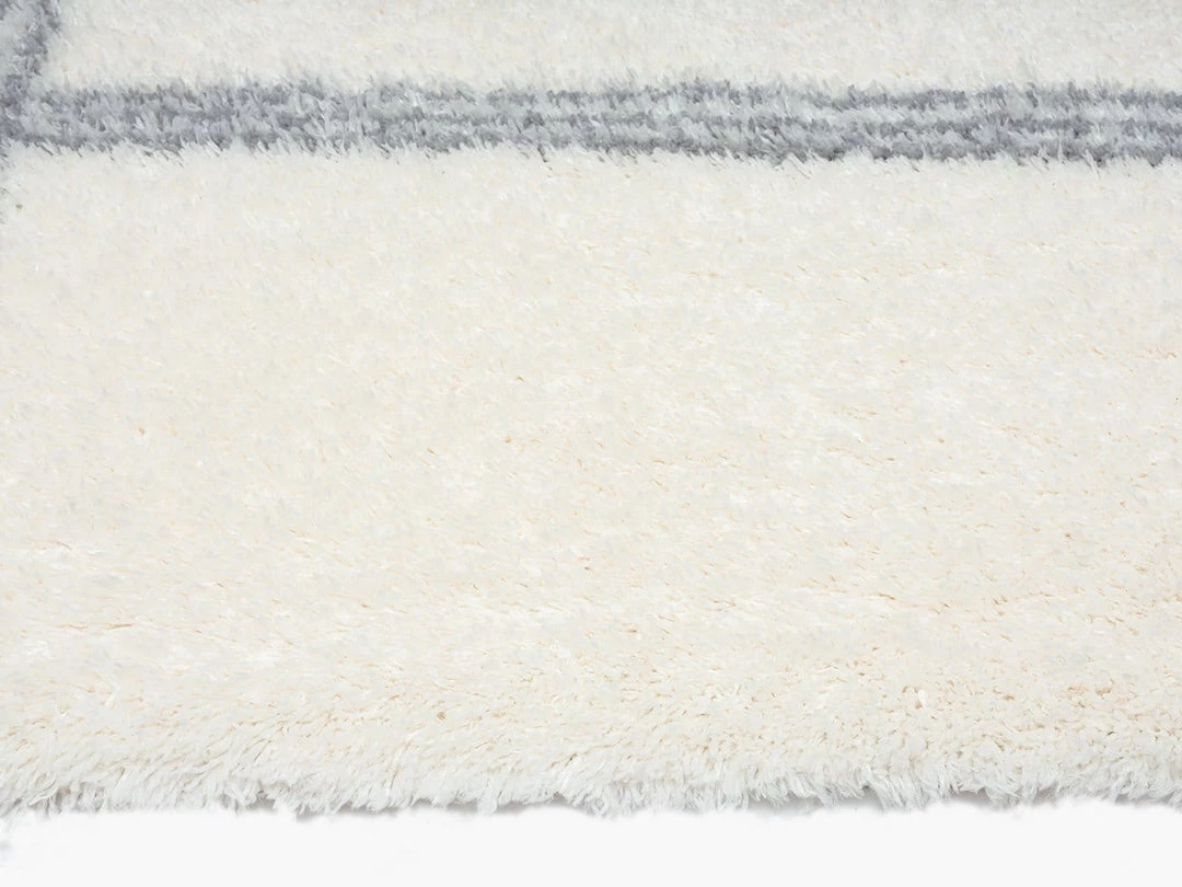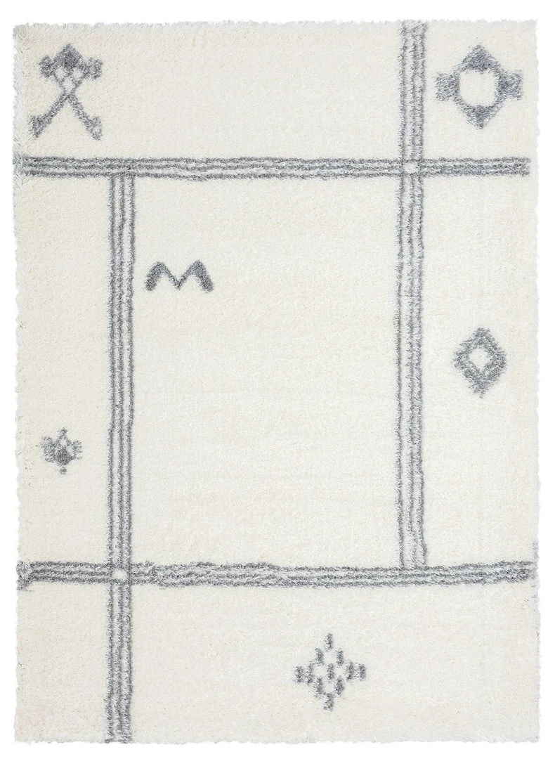 Makara is a beautiful ivory shag style rug with a minimal tribal pattern in multi-tones of grey.