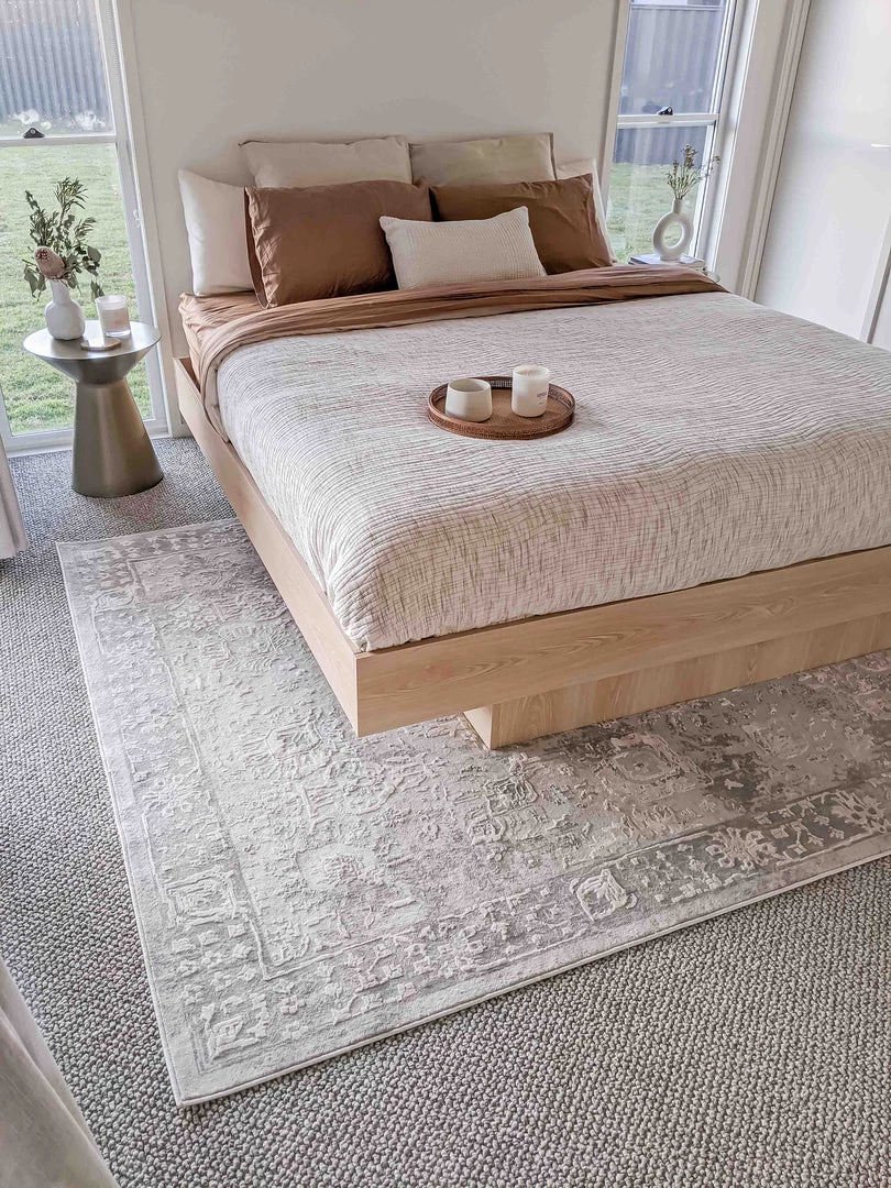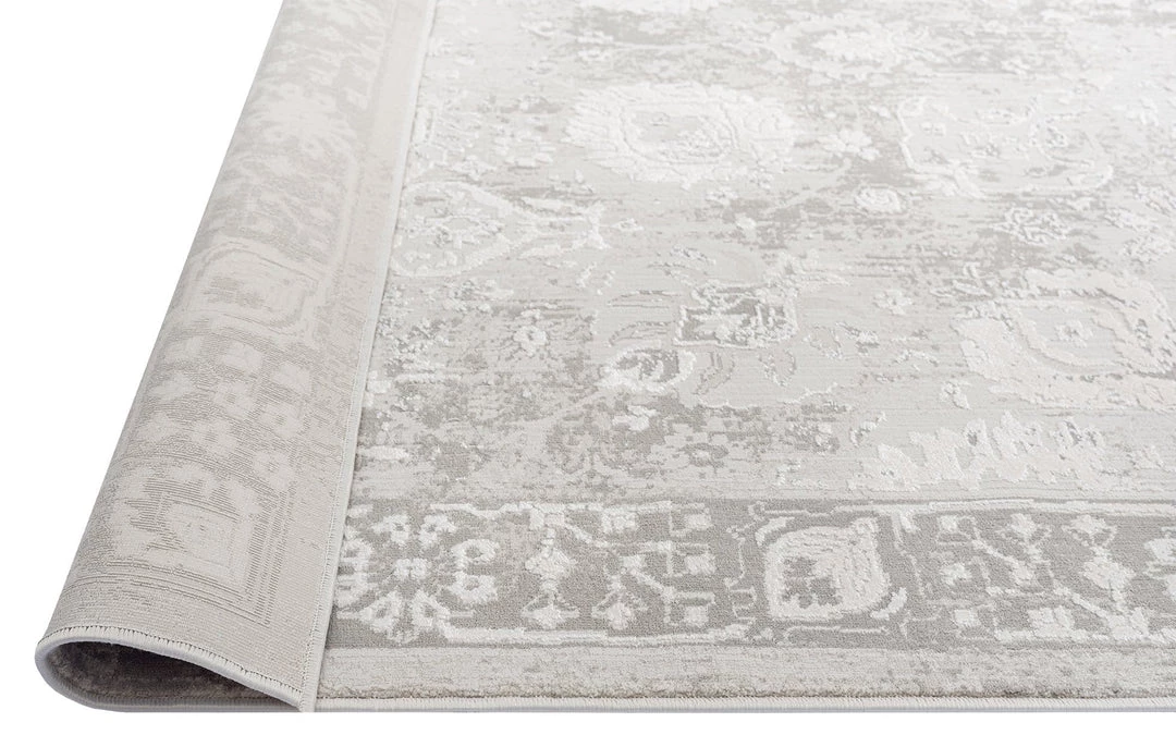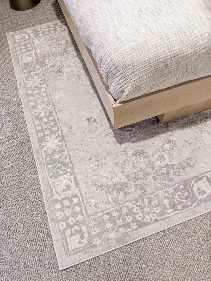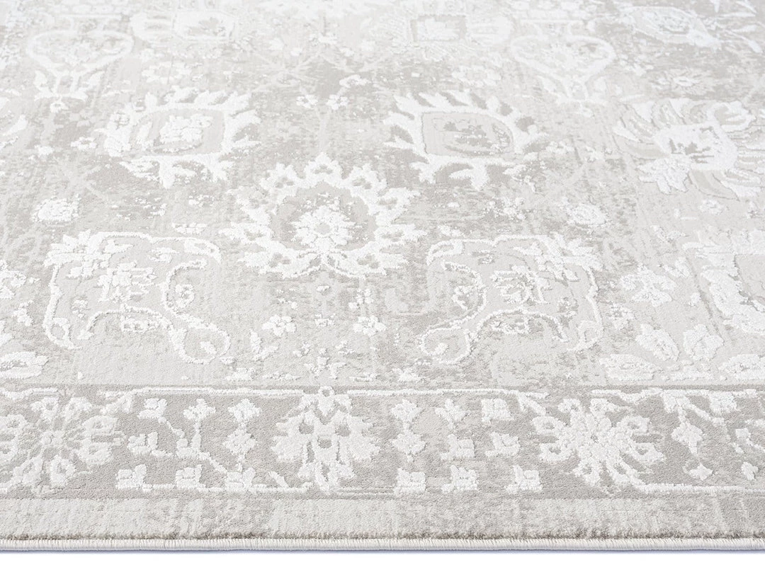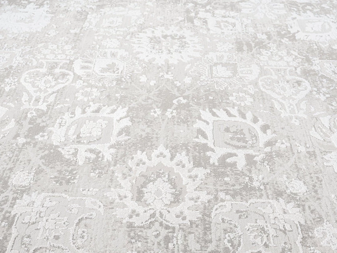 An exclusive design in the Miss Amara Collection, a distressed style decorated with elaborate floral motifs in transitional multi-tones of ivory and grey with subtle hints of beige. Featuring an intentionally created distressed look to give it a vintage feel (a treatment called ‘abrash’ to describe colour variations common in antique rugs). A timeless and elegant addition to a modern, tribal, coastal, bohemian or vintage space.