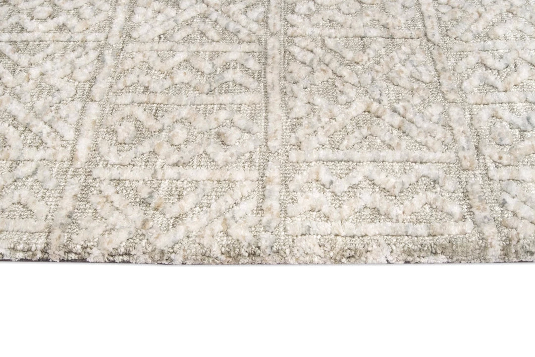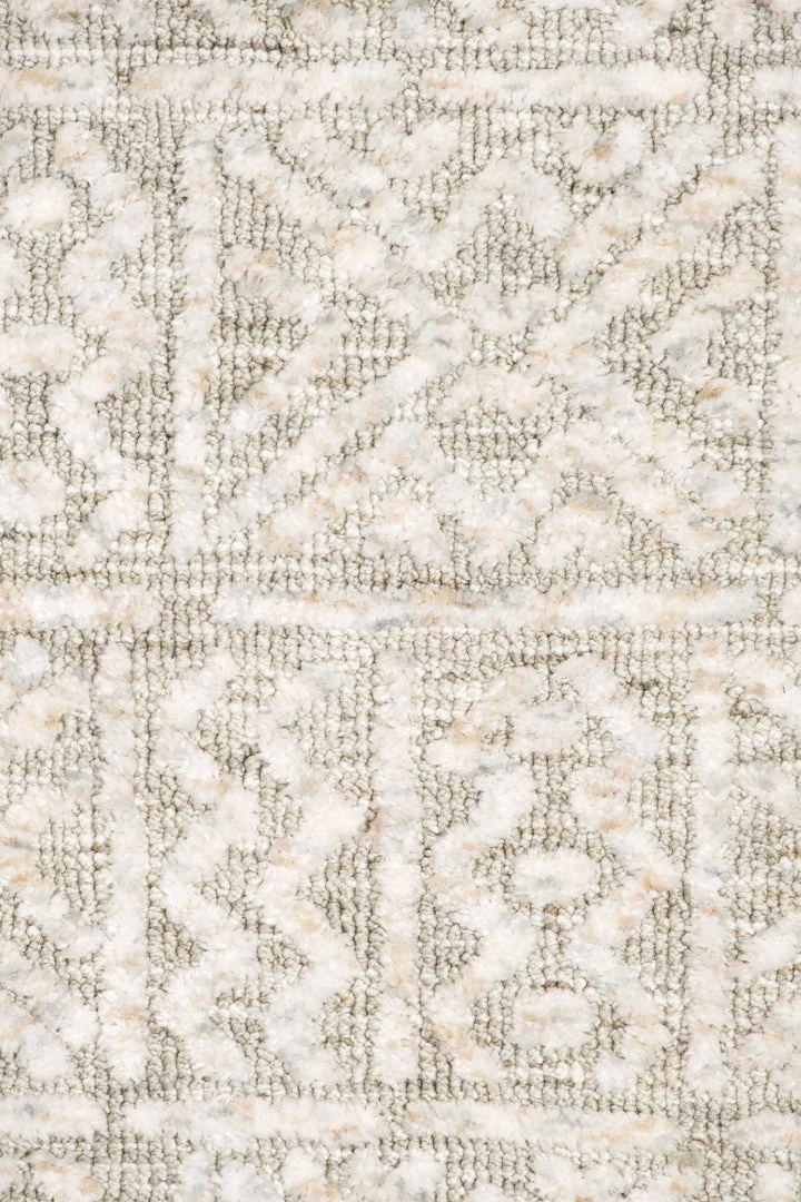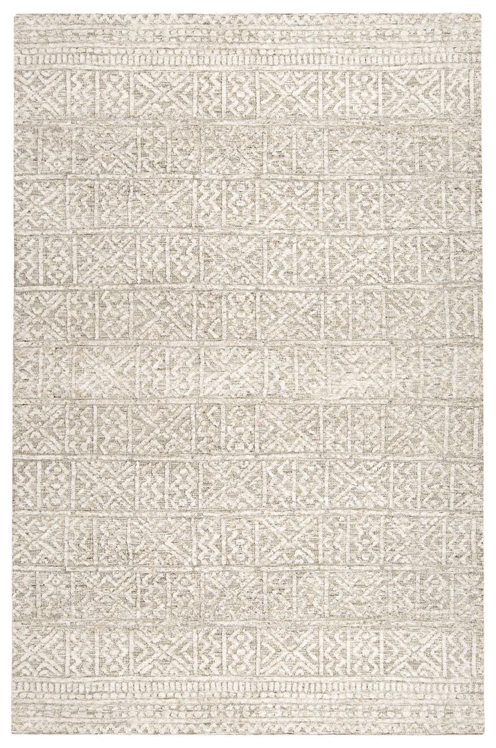 Melia is a lovely warm grey and ivory geometric tribal textured pattern rug on a background of grey and hushed green multi-tones.