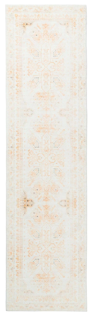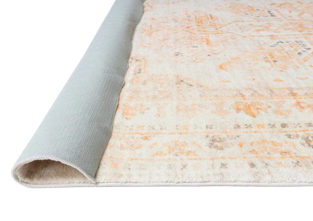 Mina is a beautiful transitional washable and foldable rug with a warm palette of orange and cream tones with subtle hints of beige.