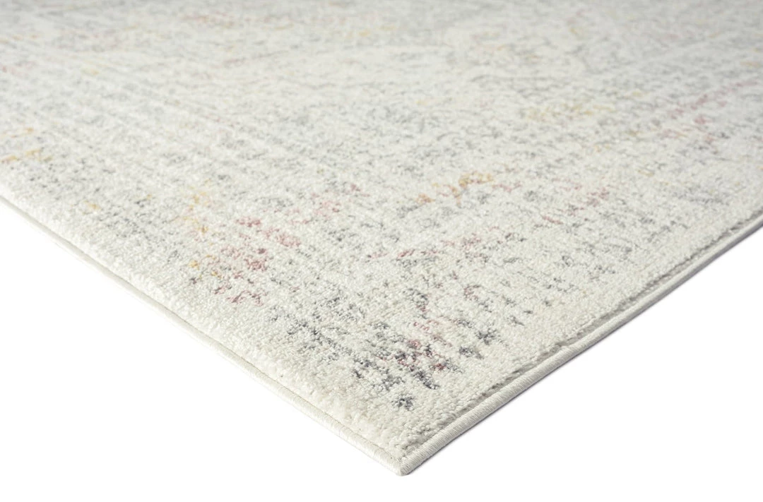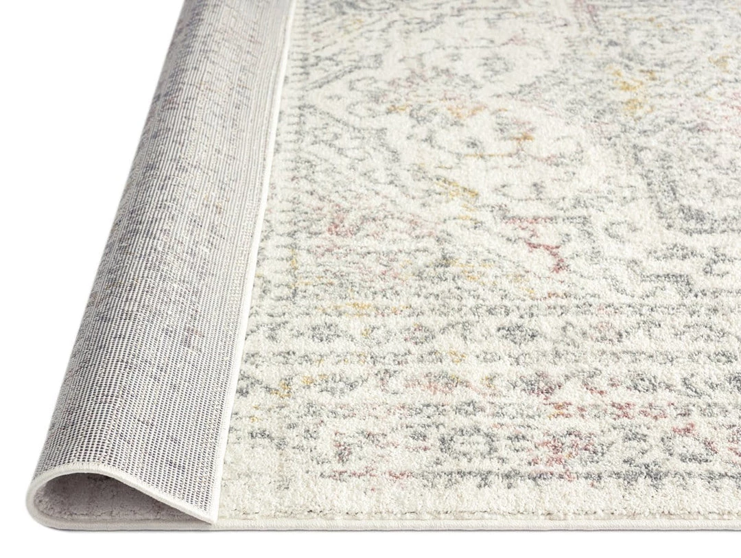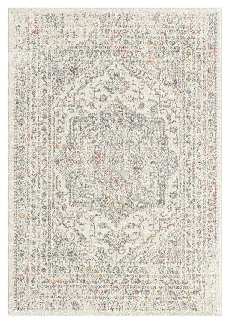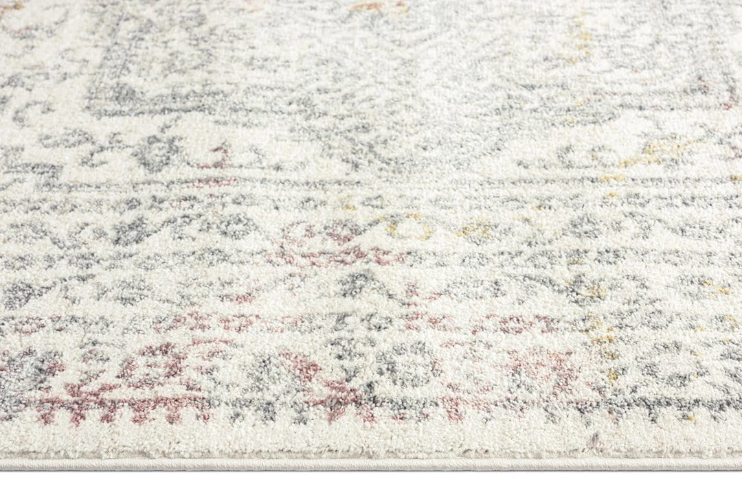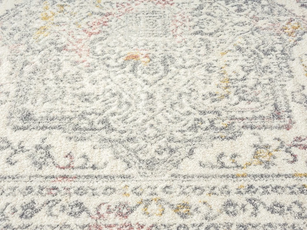 Nasya is a lovely pink, yellow and grey traditional floral medallion rug with a cream background.
