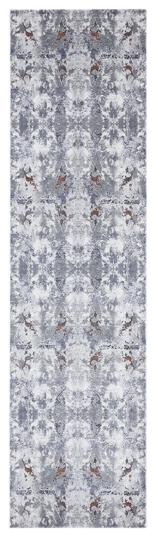 Neve is an elegant blue-grey and bronze transitional motif runner rug.