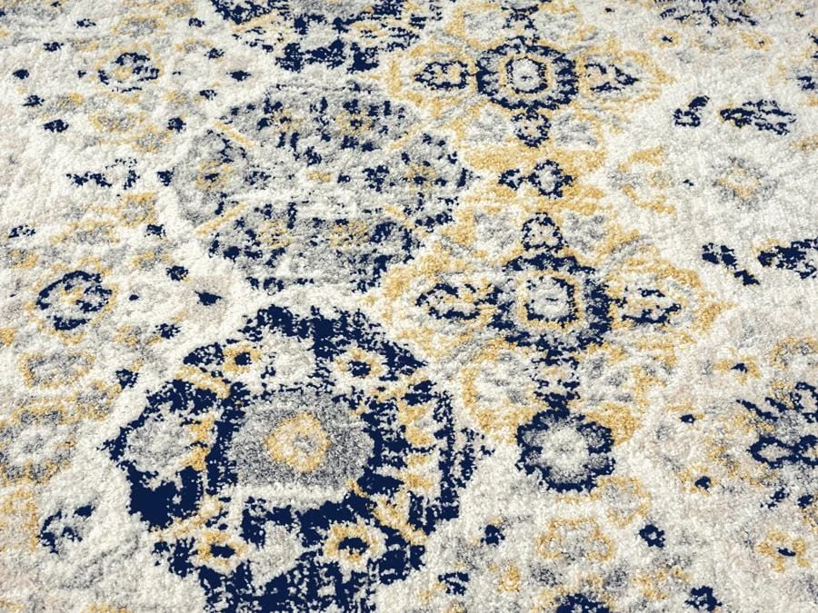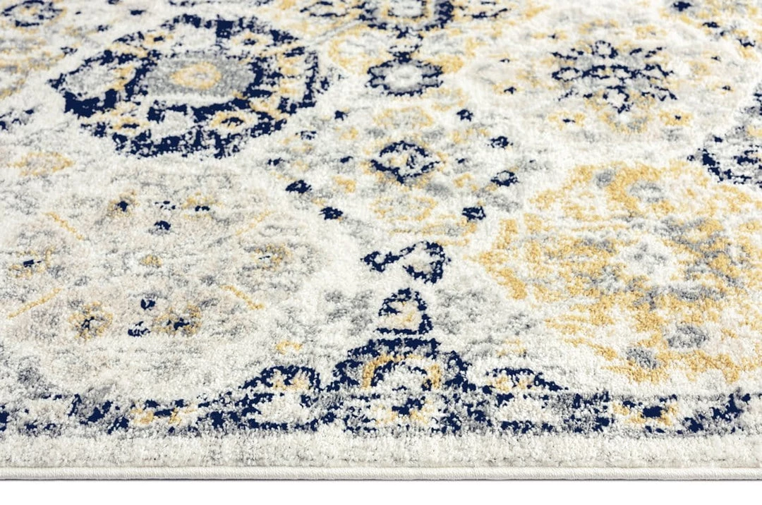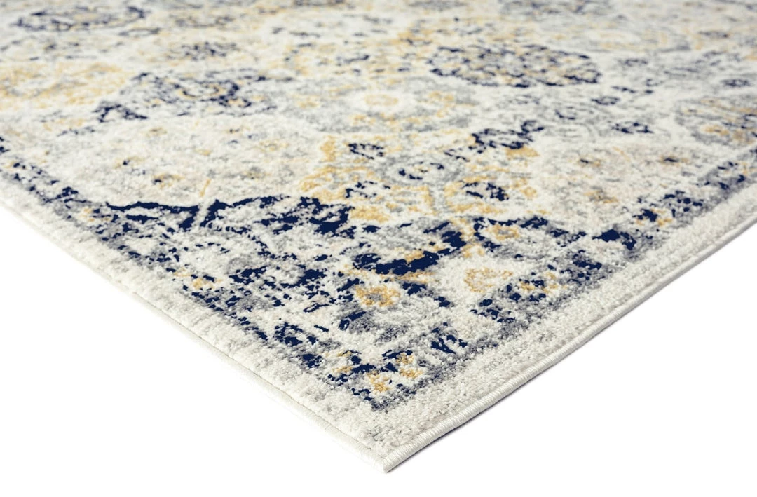 Priscilla is a lovely transitional yellow and navy blue traditional rug with a floral motif.
