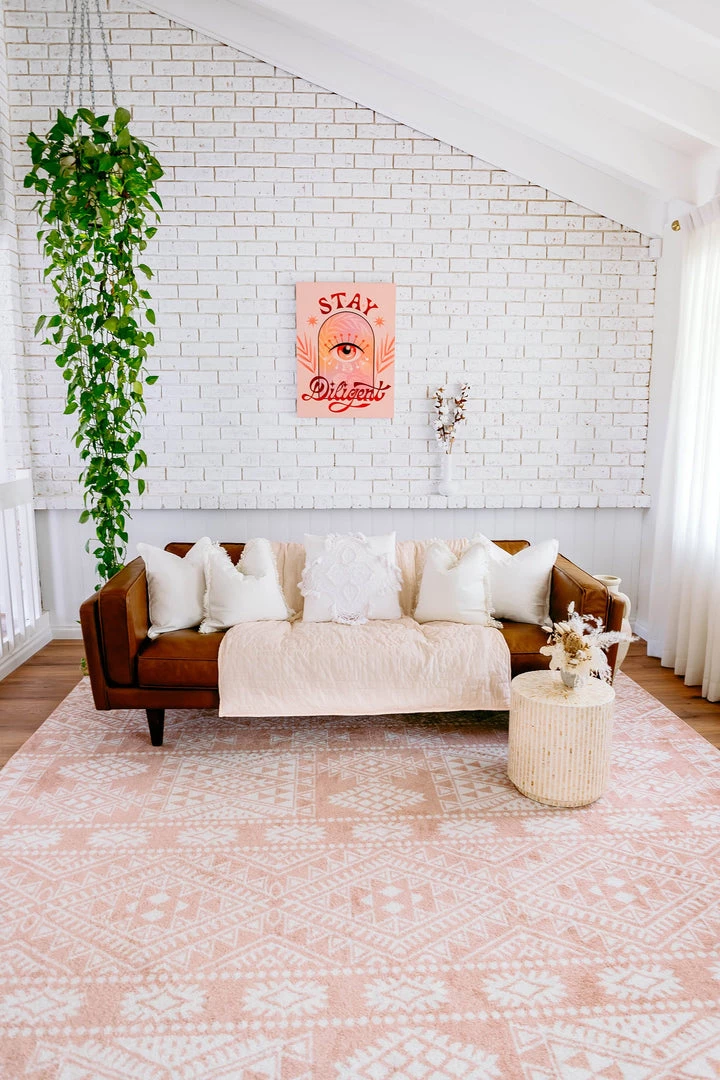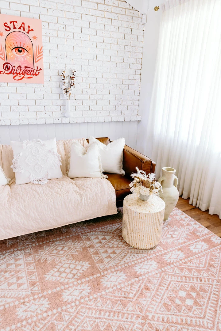 An exclusive design in the Miss Amara Collection, Rita is a beautiful blend of warm blush peach tones topped with a detailed ivory tribal pattern. A lovely addition to a modern, tribal or bohemian space complimenting neutral and natural palettes.